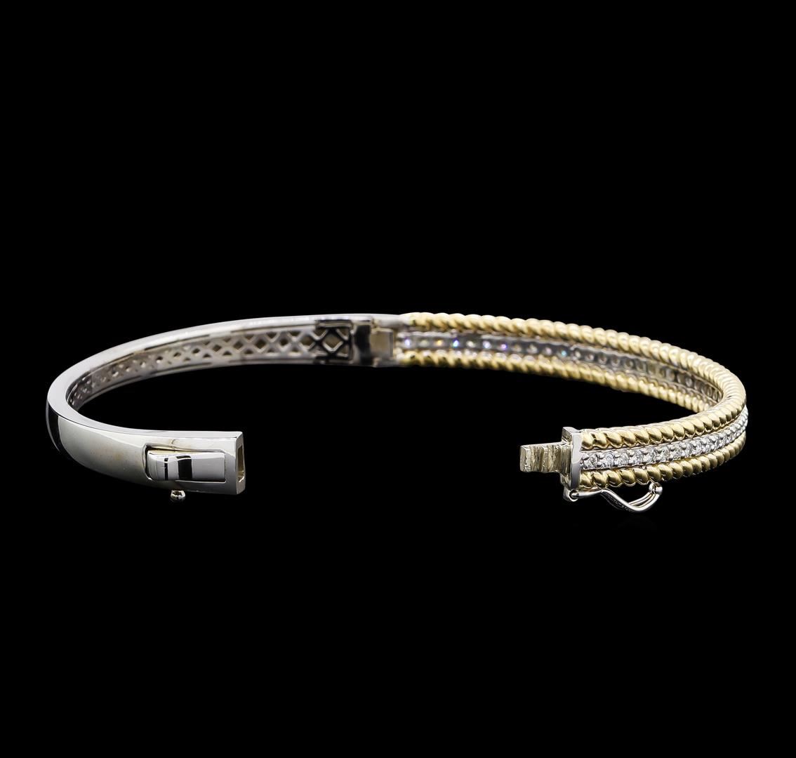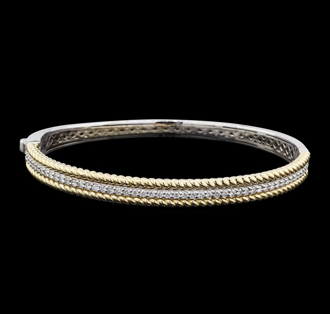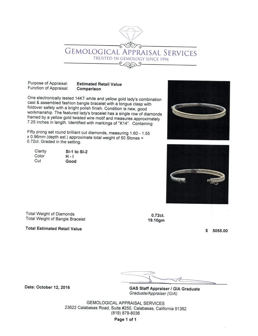 One electronically tested 14KT white and yellow gold lady's combination cast & assembled fashion bangle bracelet with a tongue clasp with foldover safety with a bright polish finish. The featured lady's bracelet has a single row of diamonds framed by a yellow gold twisted wire motif and measures approximately 7.25 inches in length. Identified with markings of 'K14'. Condition is new, good workmanship. Containing: Fifty prong set round brilliant cut diamonds, measuring 1.60 - 1.55 x 0.96mm (depth est.) approximate total weight of 50 Stones = 0.72ct. Graded in the setting. Clarity SI-1 to SI-2. Color: H - I Cut Good. Total Weight of Diamonds 0.72ct.. Total Weight of Bangle Bracelet 19.10gm. GAS Appraised at $5,055.00.