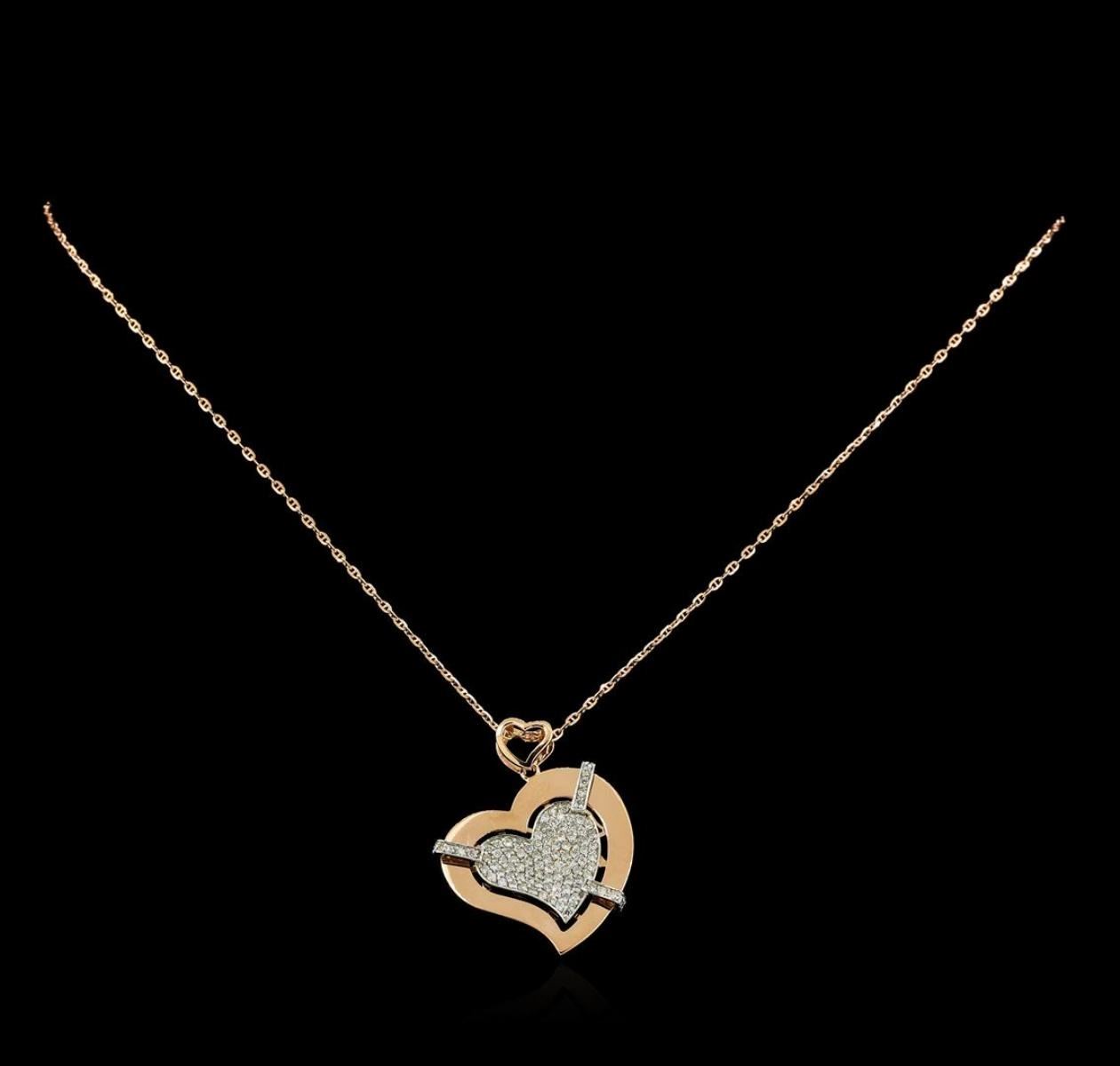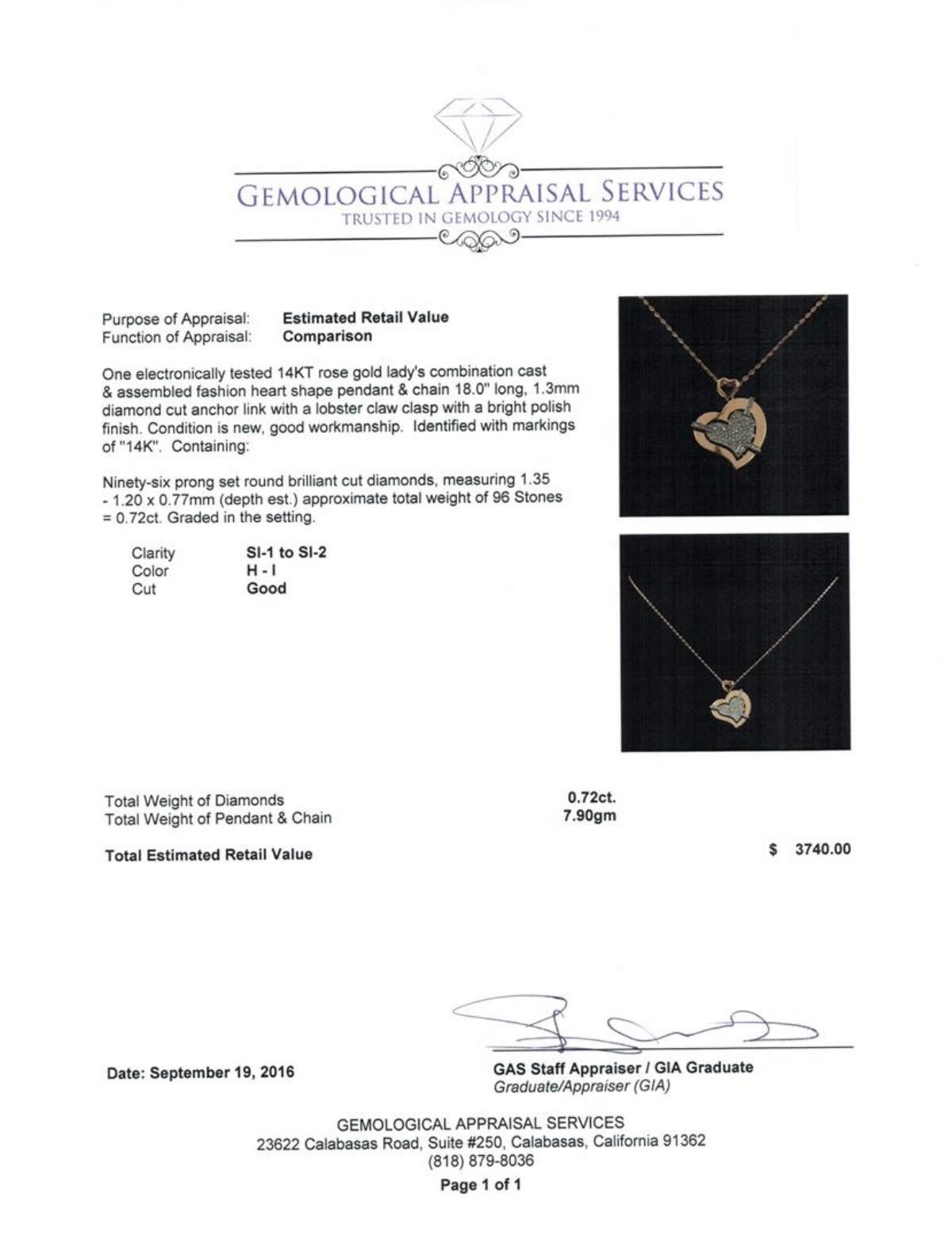 One electronically tested 14KT rose gold lady's combination cast & assembled fashion heart shape pendant & chain 18.0' long, 1.3mm diamond cut anchor link with a lobster claw clasp with a bright polish finish. Identified with markings of '14K'. Condition is new, good workmanship. Containing: Ninety-Six prong set round brilliant cut diamonds, measuring 1.35 - 1.20 x 0.77mm (depth est.) approximate total weight of 96 Stones = 0.72ct. Graded in the setting. Clarity SI-1 to SI-2. Color: H - I Cut Good. Total Weight of Diamonds 0.72ct.. Total Weight of Pendant & Chain 7.90gm. GAS Appraised.