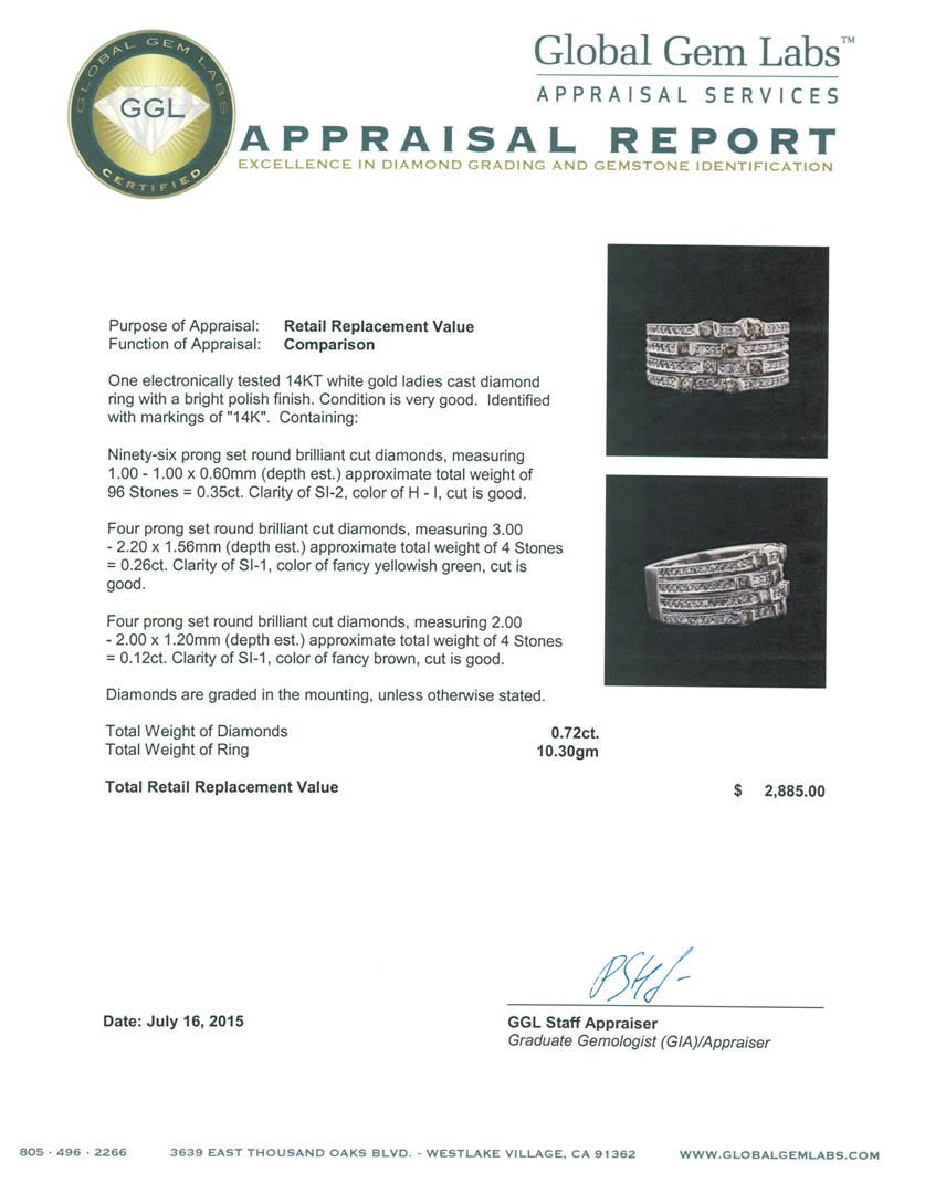One electronically tested 14KT white gold ladies cast diamond ring with a bright polish finish. Identified with markings of "14K". Condition is very good. Containing: Ninety-Six prong set round brilliant cut diamonds, measuring 1.00 - 1.00 x 0.60mm (depth est.) approximate total weight of 96 Stones = 0.35ct. Clarity: SI-2. Color: H - I, Cut is Good. Four prong set round brilliant cut diamonds, measuring 3.00 - 2.20 x 1.56mm (depth est.) approximate total weight of 4 Stones = 0.26ct. Clarity: SI-1, color of fancy yellowish green, cut is good. Four prong set round brilliant cut diamonds, measuring 2.00 - 2.00 x 1.20mm (depth est.) approximate total weight of 4 Stones = 0.12ct. Clarity: SI-1, color of fancy brown, cut is good. Diamonds are graded in the mounting, unless otherwise stated. Total Weight of Diamonds 0.72ct. Total Weight of Ring 10.30 grams. GGL Appraised at $2,885.00.