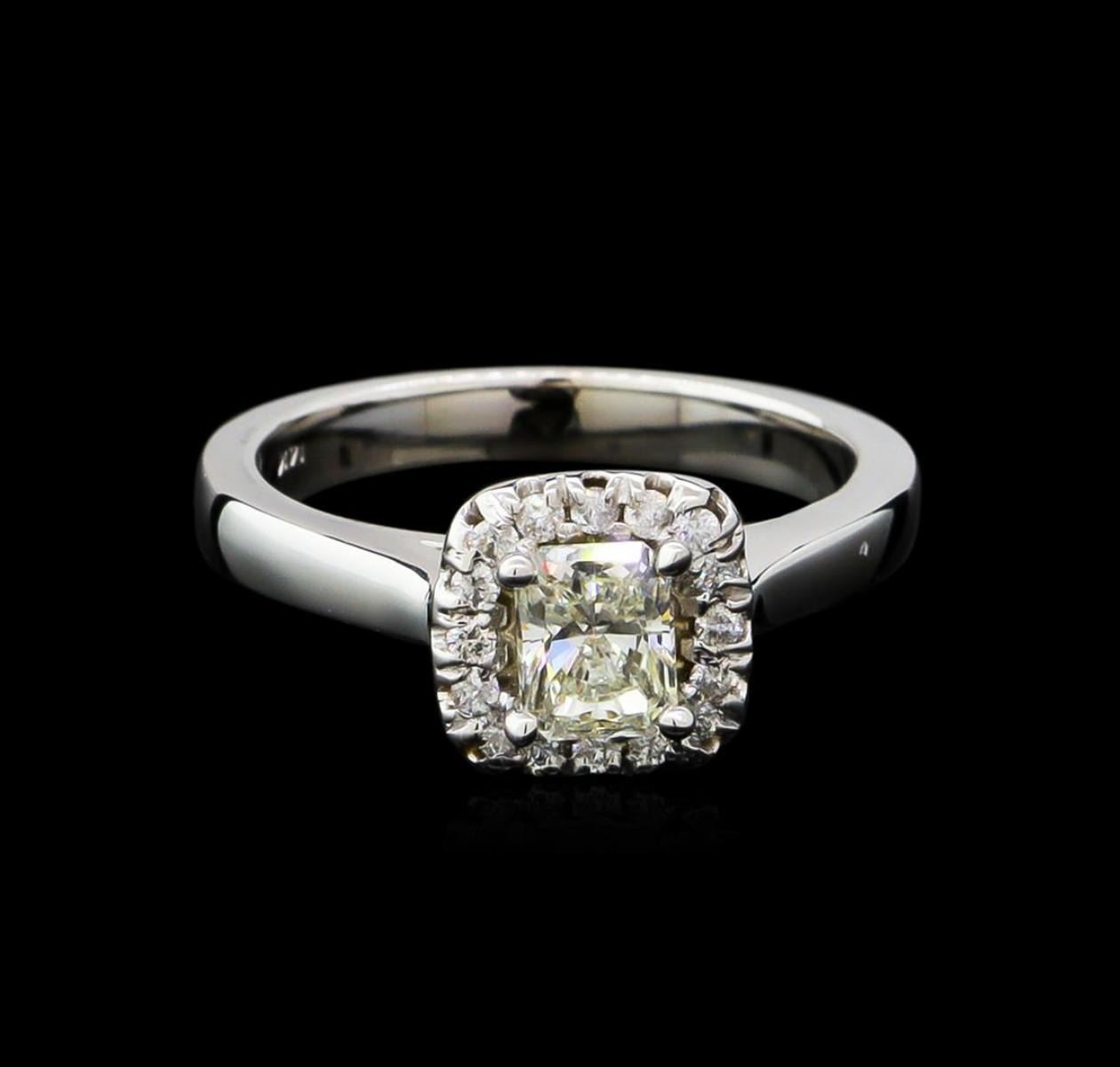One electronically tested 14KT white gold ladies cast diamond unity ring with a bright polish finish. The featured diamond is set within a diamond bezel, completed by a two millimeter wide band. Identified with markings of "14K". Condition is new, good workmanship. Containing: One prong set radiant shaped cut diamond, measuring 5.45 x 4.20 x 2.94mm (depth est.) approximate weight of 0.55ct with a medium blue fluorescence. Graded in the setting. Clarity: VVS-2. Color: K. Depth 70.0%. Table 66.7%. Sixteen prong set round brilliant cut diamonds, measuring 1.40 - 1.30 x 0.81mm (depth est.) approximate total weight of 16 Stones = 0.17ct. Graded in the setting. Clarity: SI-2 to I-2. Color: G - I. Total Weight of Diamonds 0.72ct. Total Weight of Ring 4.71gm. AIG Appraised.