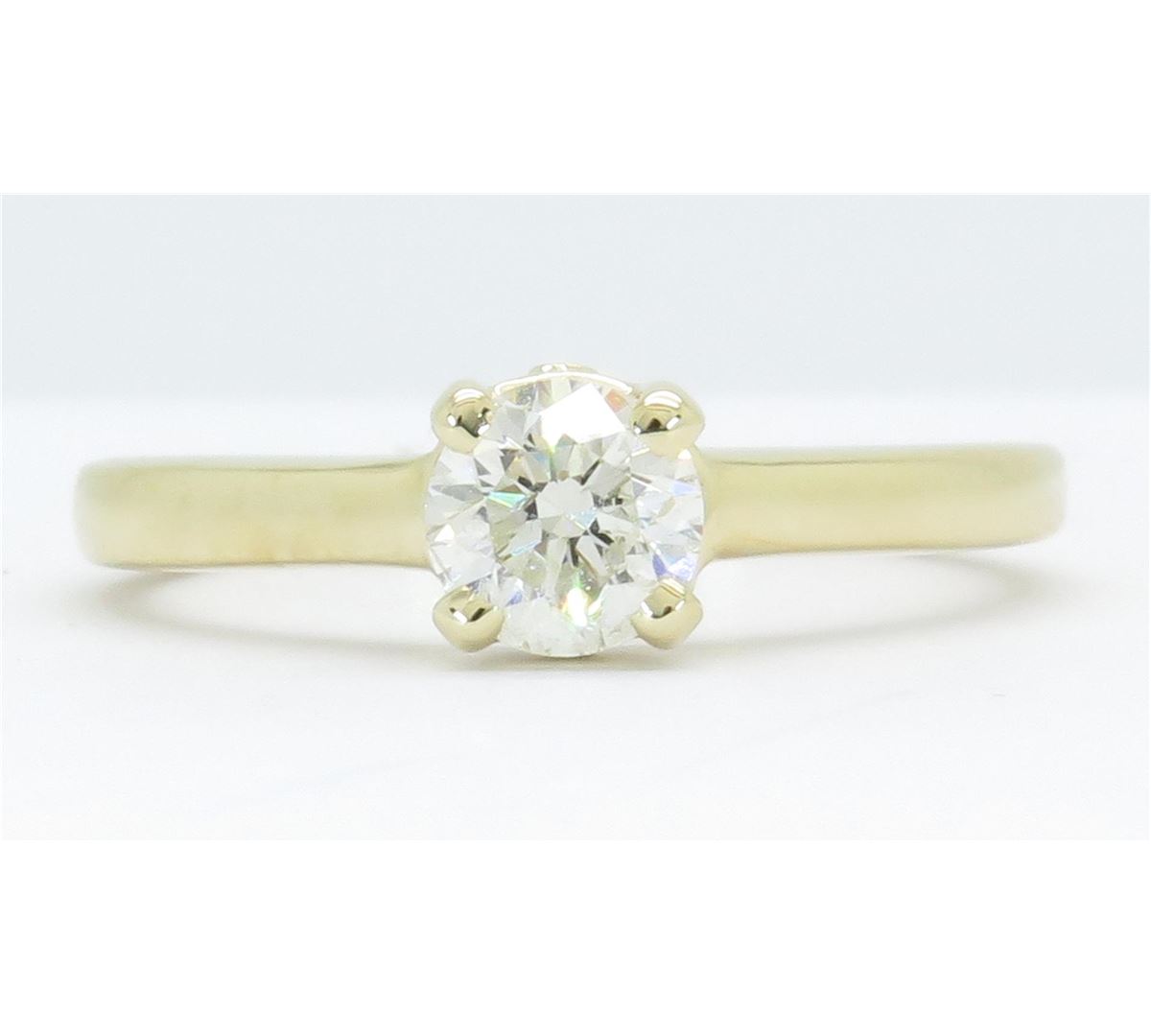 One tested 14K yellow gold diamond ring. Containing: One Round Brilliant Cut Diamond. Approximate size: .72CT, Clarity: I1, Color: K. Diamonds are graded in the mounting, unless otherwise stated. Weight: 3.8 grams. Size: 8.0
