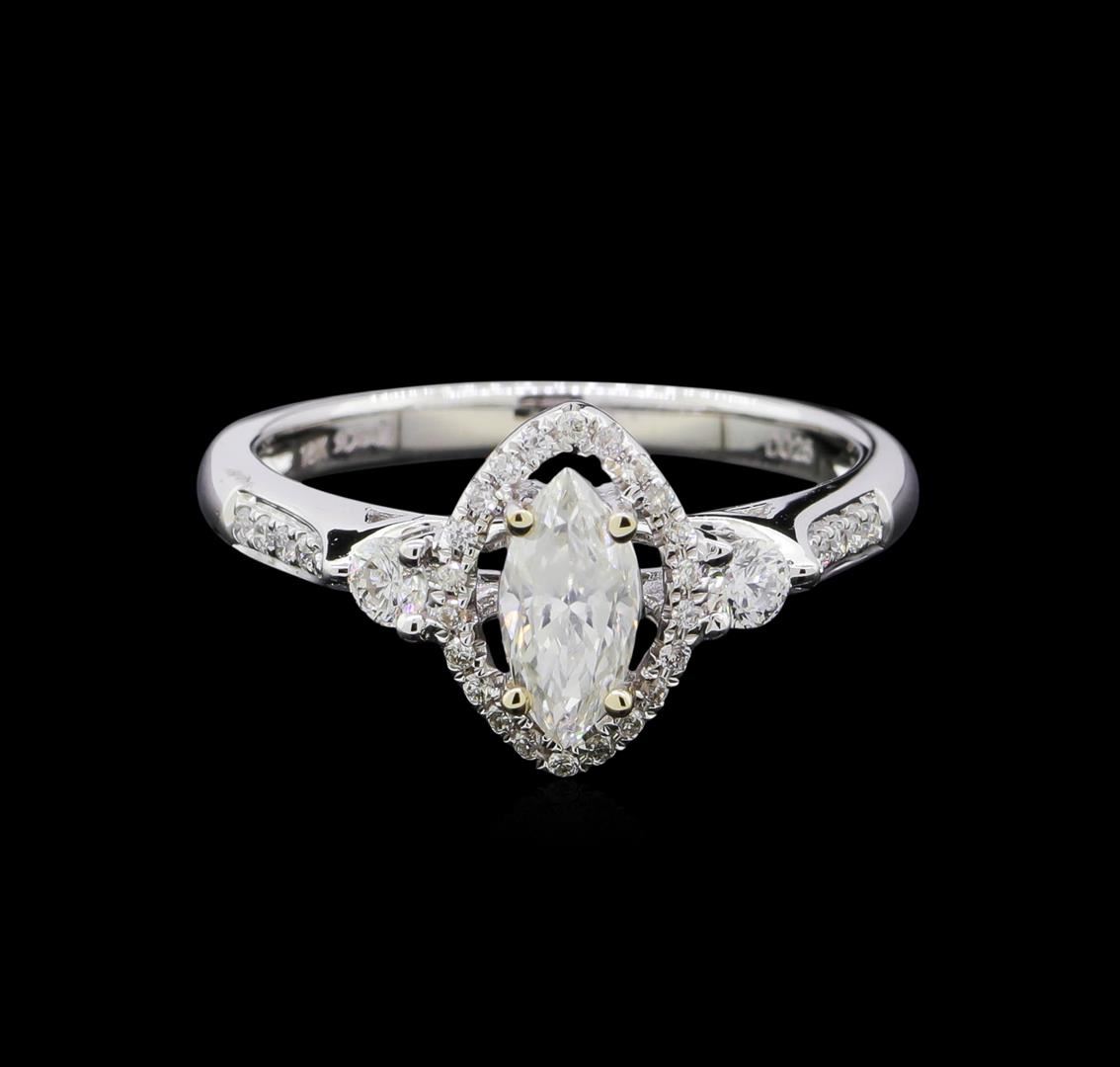 One electronically tested 18KT white gold ladies cast diamond unity ring with a bright polish finish. The featured diamond is set within a diamond bezel supported by diamond set shoulders, completed by a two millimeter wide band. Trademark is HANA. Identified with markings of "18K". Condition is new, good workmanship. Containing: One prong set marquise shaped cut diamond, measuring 7.98 x 3.77 x 2.59mm exact weight 0.47ct with a strong fluorescence. EGL Report attached. Graded loose prior to setting in the EGL Laboratory Report #US 905705614D. Clarity: SI-3. Color: Depth 68.7%. Table 57.6%. Pavil. Depth%. 44.8%. Crown Angle 43.8 Degrees Thirty-Four prong & tension set round brilliant cut diamonds approximate total weight of 34 Stones = 0.25ct. Graded in the setting. Clarity: SI-1 to I-1. Color: G - I. Total Weight of Diamonds 0.72ct. Total Weight of Unity Ring 3.61gm. AIG Appraised at $4,335.00.