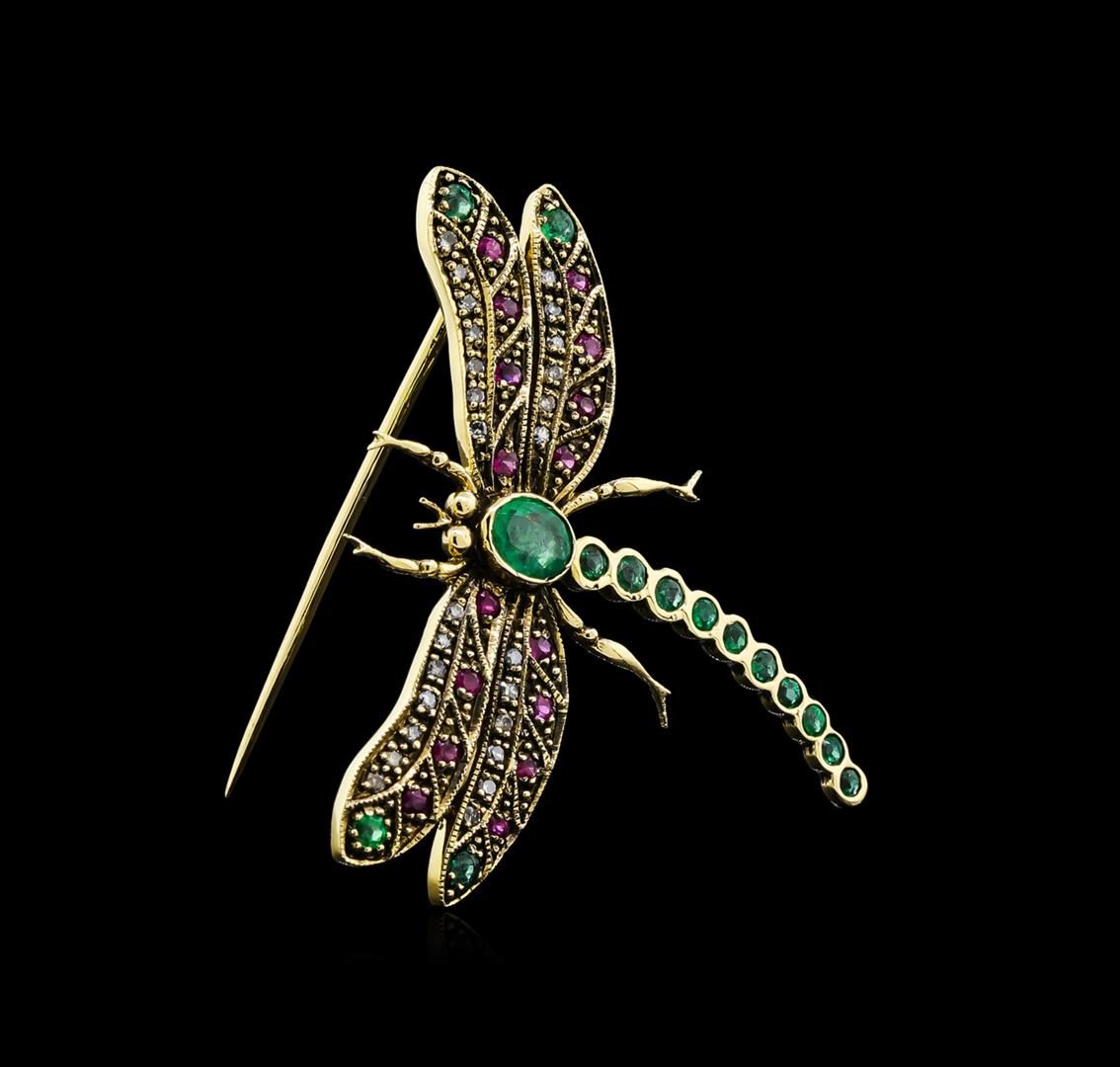 One dragonfly brooch featuring: 18KT yellow gold weighing 5.00 grams containing emeralds with a total weight of 0.72ct, rubies with a total weight of 0.25ct, and diamonds with a total weight of 0.15ct.