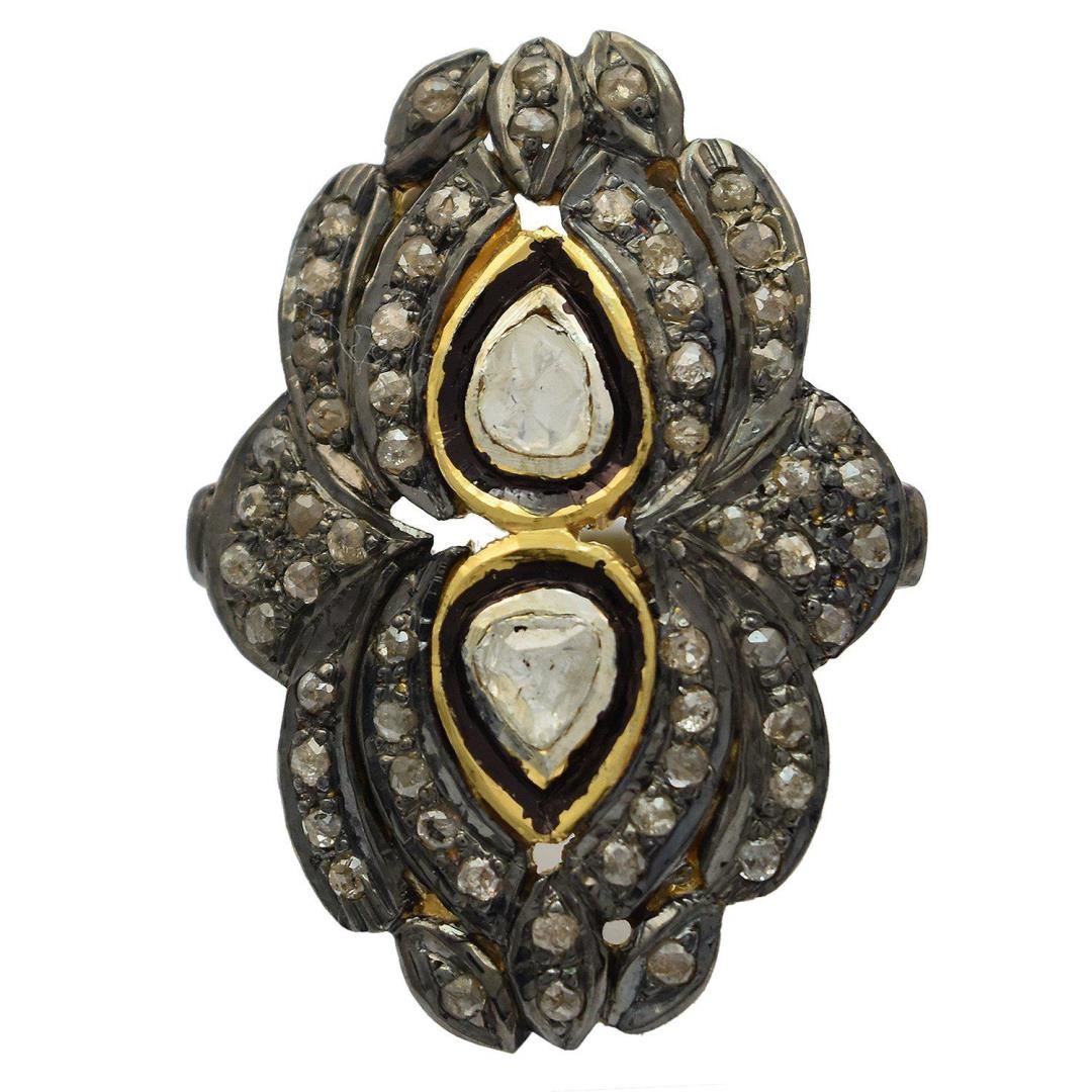 One electronically tested silver and gold ladies custom cast & assembled diamond ring. The featured diamond duo is set within an elaborate diamond gallery, completed by a two millimeter wide band. Bright and anodized finish. Condition is new, good workman