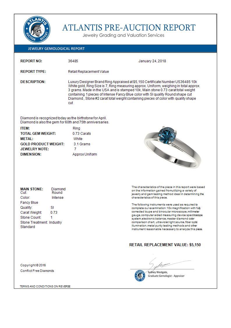 REF-70X5T -36485 ---- 0.73 CTW Certified Intense Blue SI Diamond Solitaire Engagement Ring 10K White Gold ---- Luxury Designer Brand Ring Appraised at $5,150 Certificate Number US36485 10k White gold, Ring Size is 7, Ring measuring approx. Uniform, weighing in total approx. 3 grams. Made in the USA and is stamped 10k, Main stone 0.73 carat total weight containing 1 pieces of Intense Fancy Blue color with SI quality Round shape cut Diamond , Stone #2 carat total weight containing pieces of color with quality shape cut