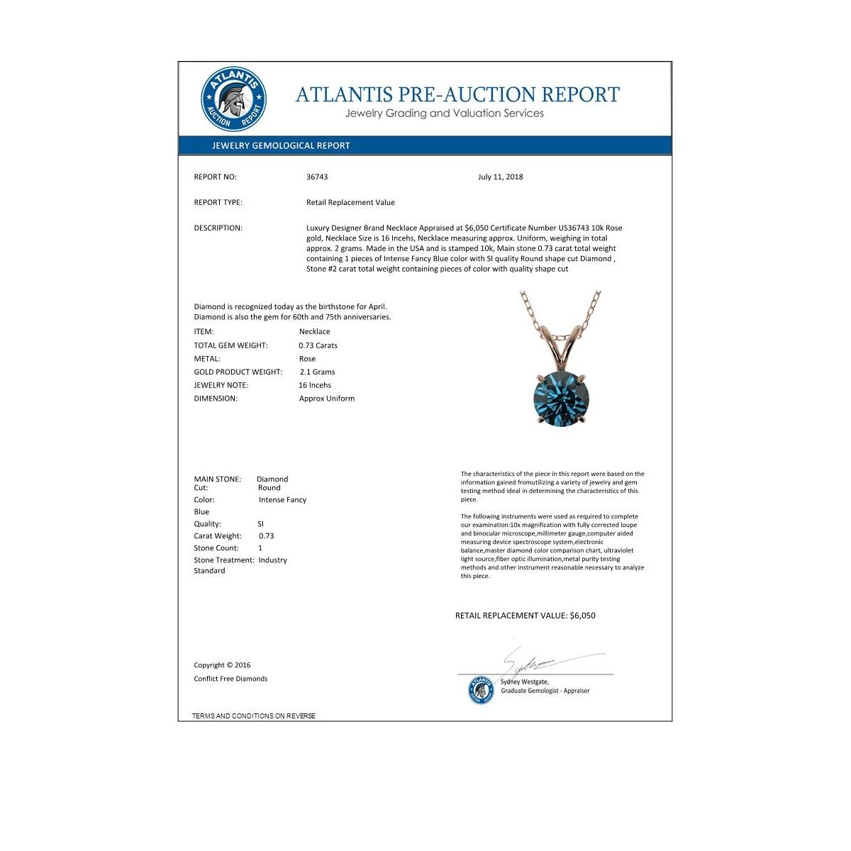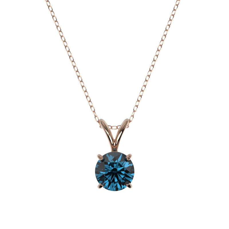REF-82Y5K -36743 ---- 0.73 CTW Certified Intense Blue SI Diamond Solitaire Necklace 10K Rose Gold ---- Luxury Designer Brand Necklace Appraised at $6,050 Certificate Number US36743 10k Rose gold, Necklace Size is 16 Incehs, Necklace measuring approx. Uniform, weighing in total approx. 2 grams. Made in the USA and is stamped 10k, Main stone 0.73 carat total weight containing 1 pieces of Intense Fancy Blue color with SI quality Round shape cut Diamond , Stone #2 carat total weight containing pieces of color with quality shape cut