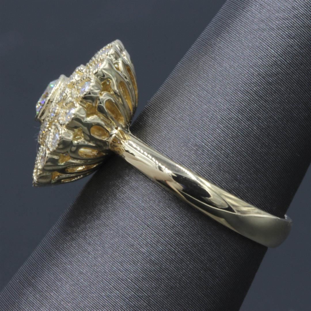 One ladies fashion ring featuring: KT yellow gold weighing 5.44 grams containing one center diamond weighing 0.30ct and side diamonds weighing 0.43ctw. The diamonds are round brilliant cut with SI1-SI2 clarity, G-H color and excellent cut. The ring is a s
