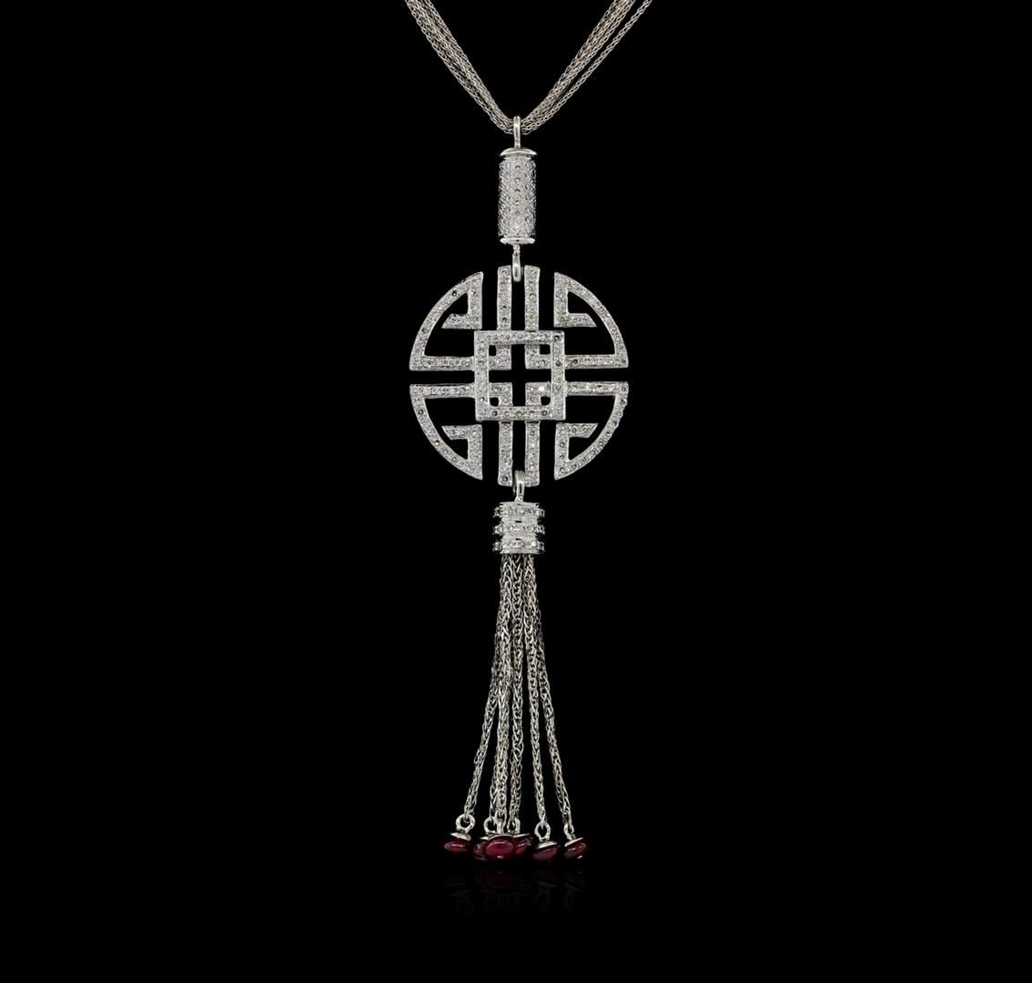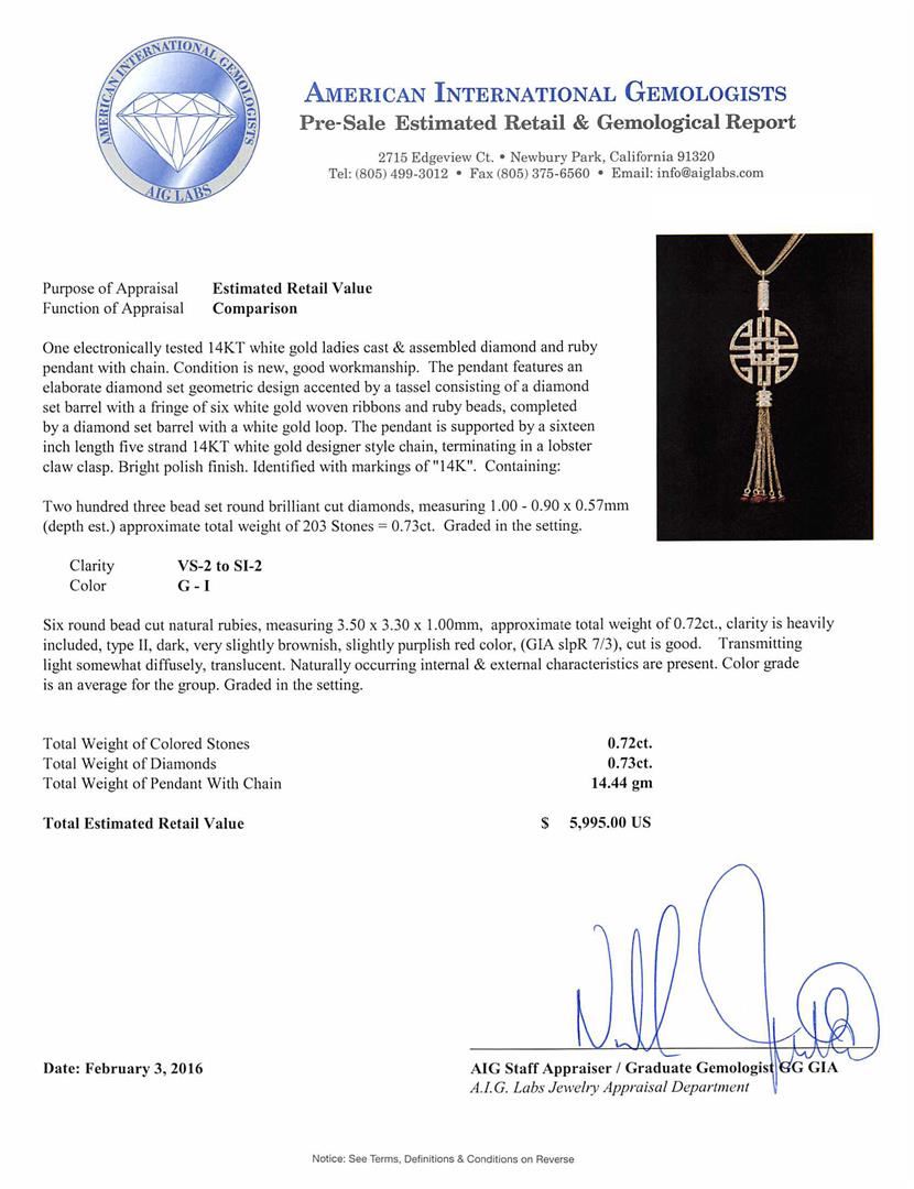 One electronically tested 14KT white gold ladies cast & assembled diamond and ruby pendant with chain. The pendant features an elaborate diamond set geometric design accented by a tassel consisting of a diamond set barrel with a fringe of six white gold woven ribbons and ruby beads, completed by a diamond set barrel with a white gold loop. The pendant is supported by a sixteen inch length five strand 14KT white gold designer style chain, terminating in a lobster claw clasp. Bright polish finish. Identified with markings of "14K". Condition is new, good workmanship. Containing: Two Hundred Three bead set round brilliant cut diamonds, measuring 1.00 - 0.90 x 0.57mm (depth est.) approximate total weight of 203 Stones = 0.73ct. Graded in the setting. Clarity: VS-2 to SI-2. Color: G - I Six round bead cut natural rubies, measuring 3.50 x 3.30 x 1.00mm, approximate total weight of 0.72ct., clarity is heavily included, type II, dark, very slightly brownish, slightly purplish red color, (GIA slpR 7/3), cut is good. Transmitting light somewhat diffusely, translucent. Naturally occurring internal & external characteristics are present. Color grade is an average for the group. Graded in the setting. Total Weight of Colored Stones 0.72ct. Total Weight of Diamonds 0.73ct. Total Weight of Pendant With Chain 14.44gm. AIG Appraised at $5,995.00.