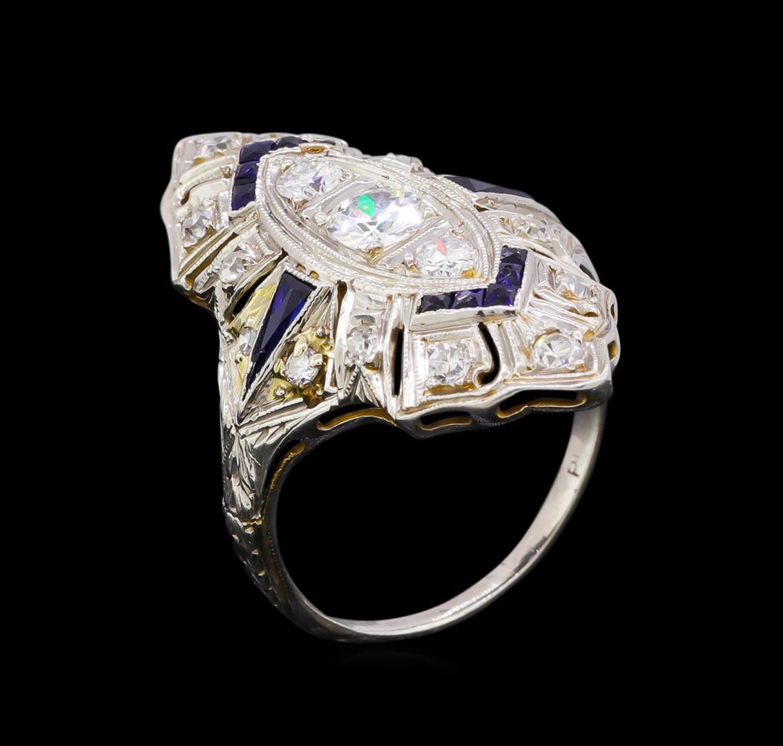 One electronically tested platinum ladies cast diamond and lab created sapphire ring. The ring features a diamond trio set within a stylized diamond lab created sapphire lattice gallery supported by tapering textured shoulders, completed by a one millimeter wide band. Bright and patterned finish with milgrain detailing. Identified with markings of "PLATINUM". Condition is good. Containing: One prong set transitional cut diamond, measuring 4.30 - 4.30 x 2.40mm (depth est.) approximate weight of 0.27ct. Graded in the setting. Clarity: SI-1 . Color: G Two prong set transitional cut diamonds, measuring 2.80 - 2.80 x 1.70mm (depth est.) approximate total weight of 2 Stones = 0.16ct. Graded in the setting. Clarity: SI-1 . Color: G - H Fourteen prong set single and round brilliant cut diamonds, measuring 2.10 x 1.50 x 1.08mm (depth est.) approximate total weight of 14 Stones = 0.30ct. Graded in the setting. Clarity: SI-1 to I-1 . Color: G - I Two bezel set triangle mixed cut laboratory created blue sapphires, measuring 4.75 x 2.00. x 1.40mm, approximate total weight of 0.20ct., clarity is eye clean, type II, dark, moderately strong, blue color, (GIA B 7/4), cut is good. Transmitting light with no distortion, transparent. Measurements & the color grade are an average for the pair. Graded in the setting. Ten channel set square mixed cut laboratory created blue sapphires, measuring 1.40 x 1.00. x 0.78mm, approximate total weight of 0.10ct., clarity is eye clean, type II, dark, moderately strong, blue color, (GIA B 7/4), cut is good. Transmitting light with no distortion, transparent. Measurements & the color grade are an average for the group. Graded in the setting. Total Weight of Colored Stones 0.30ct.. Total Weight of Diamonds 0.73ct.. Total Weight of Ring 4.97gm AIG Appraised at $3,370.00.
