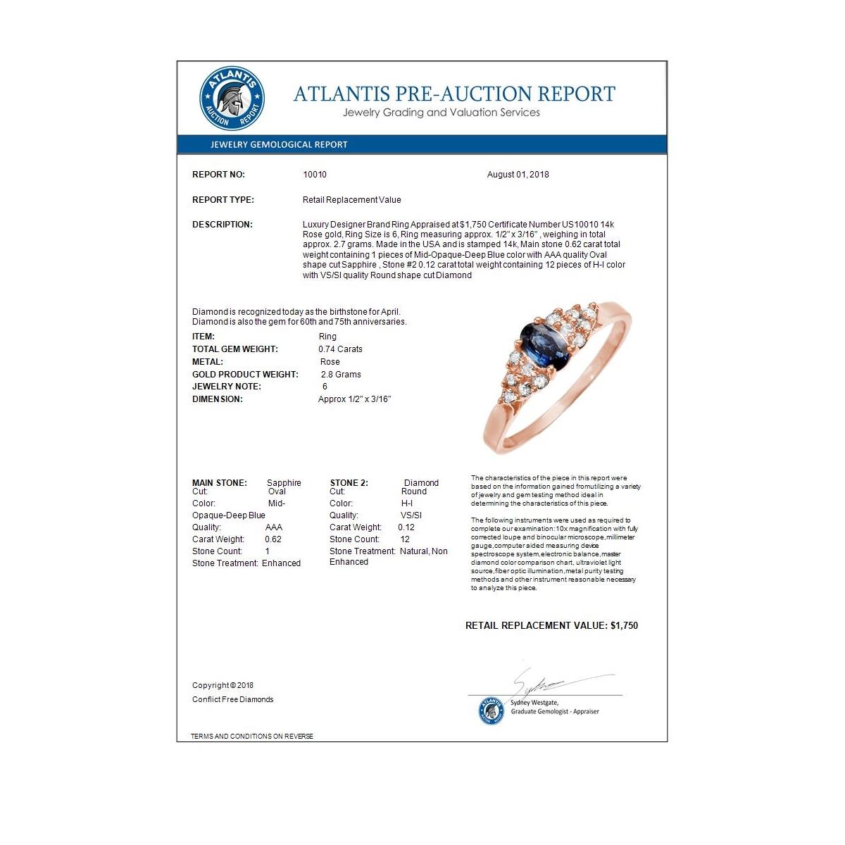 REF-28X8T -10010 ---- 0.74 CTW Blue Sapphire & Diamond Ring 14K Rose Gold ---- Luxury Designer Brand Ring Appraised at $1,750 Certificate Number US10010 14k Rose gold, Ring Size is 6, Ring measuring approx. 1/2" x 3/16" , weighing in total approx. 2.7 grams. Made in the USA and is stamped 14k, Main stone 0.62 carat total weight containing 1 pieces of Mid-Opaque-Deep Blue color with AAA quality Oval shape cut Sapphire , Stone #2 0.12 carat total weight containing 12 pieces of H-I color with VS/SI quality Round shape cut Diamond