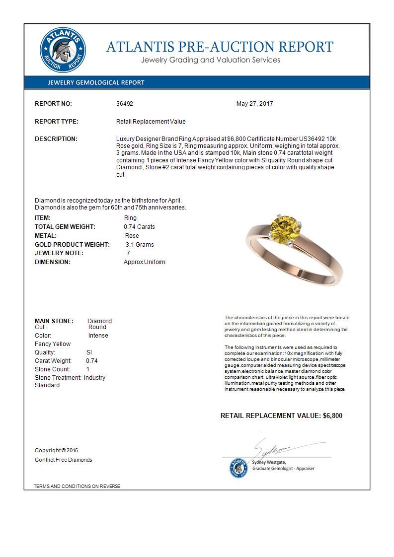 0.74 CTW Certified Intense Yellow SI Diamond Solitaire Engagement Ring 10K Rose Gold ---- Luxury Designer Brand Ring Appraised Retail Price at $6,800 ---- SKU Number US36492 10k Rose gold Ring Size is 7, Ring measuring approx. Uniform, weighing in total approx. 3 grams. Made in the USA and is stamped 10k, Main stone 0.74 carat total weight containing 1 pieces of Intense Fancy Yellow color with SI quality Round shape cut Diamond , Stone #2 carat total weight containing pieces of color with quality shape cut