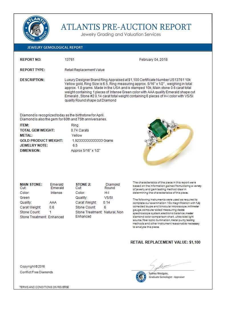 REF-16Y5K -13761 ---- 0.74 CTW Emerald & Diamond Ring 10K Yellow Gold ---- Luxury Designer Brand Ring Appraised at $1,100 Certificate Number US13761 10k Yellow gold, Ring Size is 6.5, Ring measuring approx. 5/16" x 1/2" , weighing in total approx. 1.8 grams. Made in the USA and is stamped 10k, Main stone 0.6 carat total weight containing 1 pieces of Intense Green color with AAA quality Emerald shape cut Emerald , Stone #2 0.14 carat total weight containing 6 pieces of H-I color with VS/SI quality Round shape cut Diamond