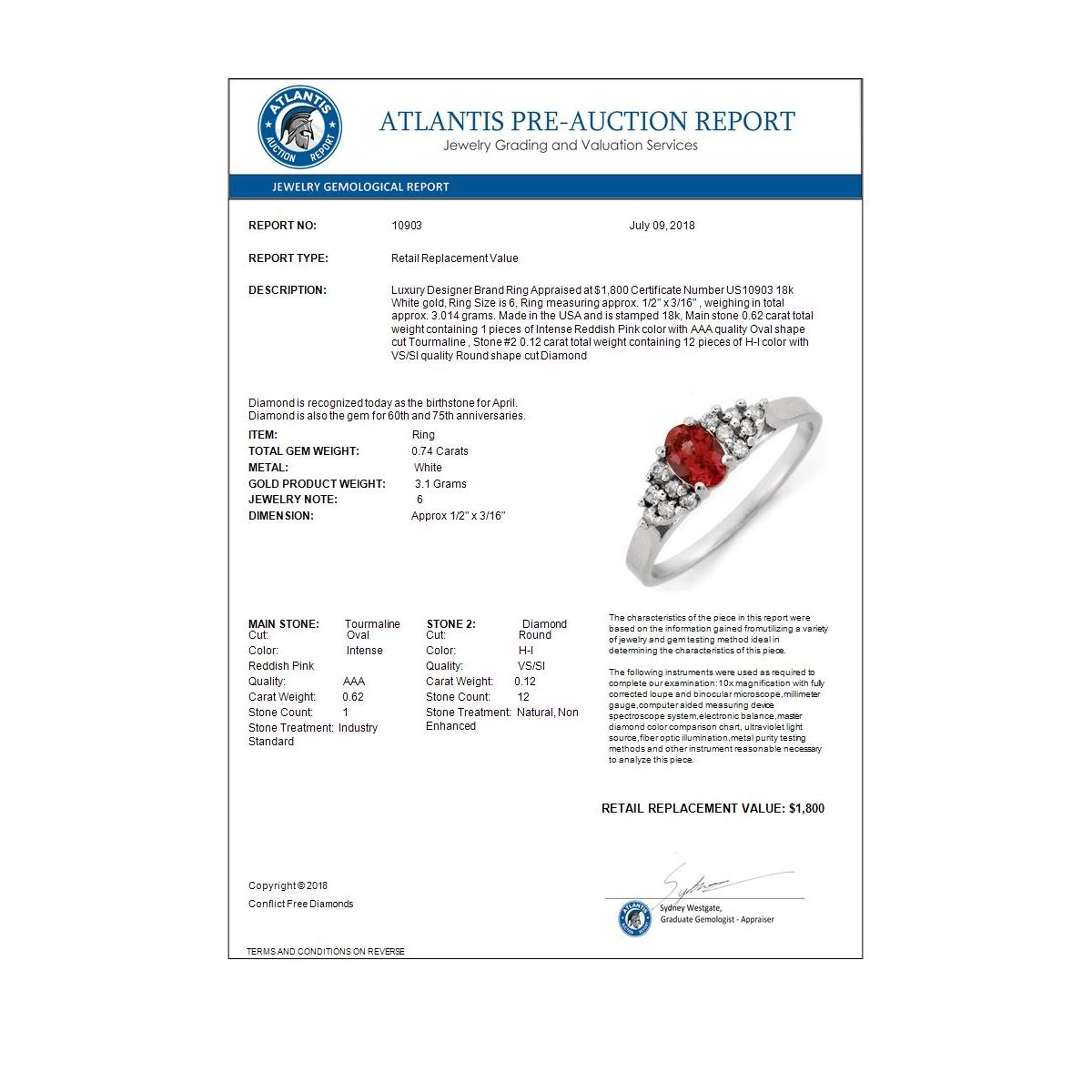 REF-23N6Y -10903 ---- 0.74 CTW Pink Tourmaline & Diamond Ring 18K White Gold ---- Luxury Designer Brand Ring Appraised at $1,800 Certificate Number US10903 18k White gold, Ring Size is 6, Ring measuring approx. 1/2" x 3/16" , weighing in total approx. 3.014 grams. Made in the USA and is stamped 18k, Main stone 0.62 carat total weight containing 1 pieces of Intense Reddish Pink color with AAA quality Oval shape cut Tourmaline , Stone #2 0.12 carat total weight containing 12 pieces of H-I color with VS/SI quality Round shape cut Diamond