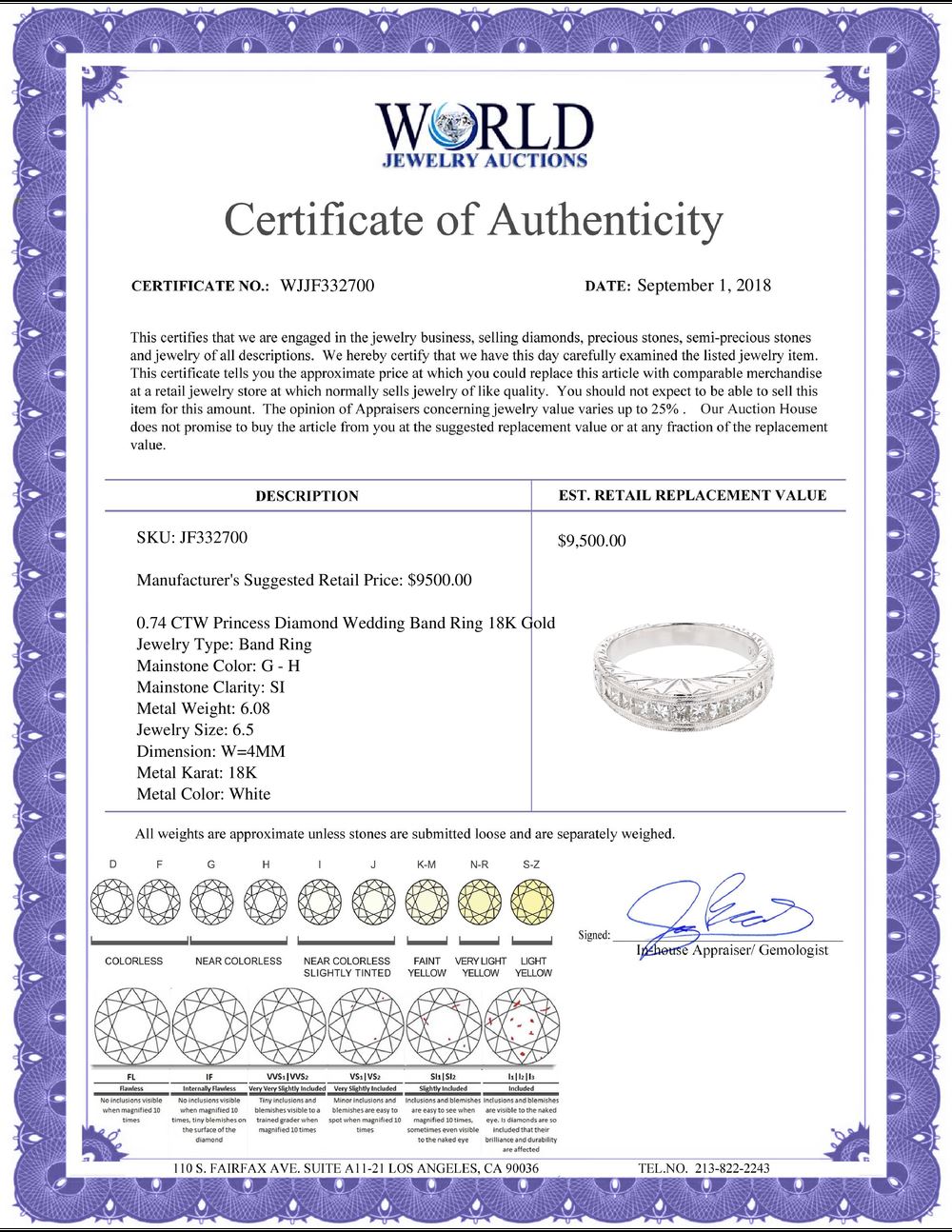 WORLD JEWELRY AUCTION believes to the best of its knowledge that the information presented in any listing has come from reliable sources. Such information is presented solely for the convenience of the Purchaser. WJA makes no warranties of any kind related to the information presented in any listing. WJA further makes no warranties, either express or implied, relating to the value, marketability or condition of the lot described in any listing. Prospective bidders should investigate a lot thoroughly before bidding. By bidding the Bidder acknowledges that Bidder has investigated the lot to his or her satisfaction, or, that Bidder has chosen not to do so, and agrees to accept the lot being bid on with no objections after the sale closes. If you are uncertain please contact us with your questions prior to bidding. If you are still uncertain after we reply, please refrain from bidding. Photos other graphic material contained in any listing of generic or duplicate lots may be stock presentations and not necessarily of the specific lot.