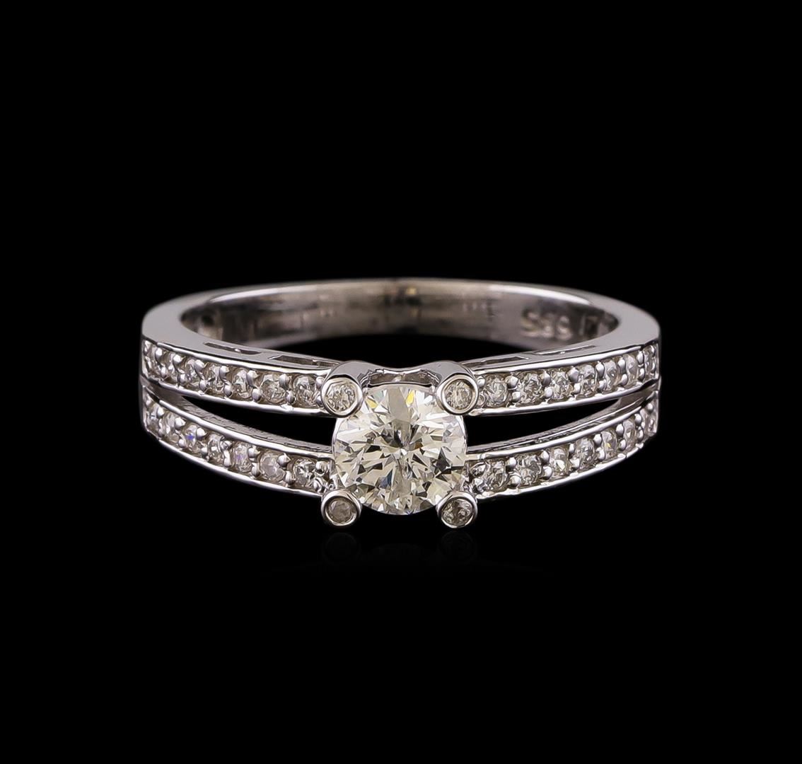One electronically tested 14KT white gold lady's cast wedding ring with a split shank with a bright polish finish. The featured lady's ring has a shank measuring 2.26 millimeters wide. Identified with markings of '585'. Condition is new, good workmanship. Containing: One prong set round brilliant cut diamond, measuring 4.99 - 4.97 x 3.14mm (depth est.) , 4.00.%. GTCF approximate weight of 0.50ct. Graded in the setting. Clarity I-1. Color: H Cut Good Twenty-Eight prong set round brilliant cut diamonds, measuring 1.30 - 1.20 x 0.78mm (depth est.) approximate total weight of 28 Stones = 0.22ct. Graded in the setting. Clarity SI-1 to SI-2. Color: H - I Cut Good Four bezel set round brilliant cut diamonds, measuring 1.10 - 1.00 x 0.65mm (depth est.) approximate total weight of 4 Stones = 0.02ct. Graded in the setting. Clarity SI-1 to I-1. Color: H - I Cut Good. Total Weight of Diamonds 0.74ct.. Total Weight of Ring 3.30gm. GAS Appraised at $4,055.00.