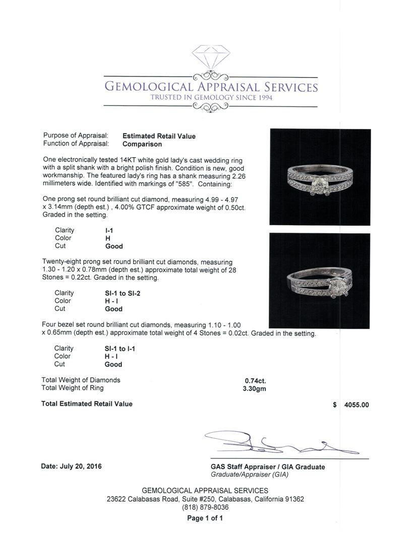 One electronically tested 14KT white gold lady's cast wedding ring with a split shank with a bright polish finish. The featured lady's ring has a shank measuring 2.26 millimeters wide. Identified with markings of '585'. Condition is new, good workmanship. Containing: One prong set round brilliant cut diamond, measuring 4.99 - 4.97 x 3.14mm (depth est.) , 4.00.%. GTCF approximate weight of 0.50ct. Graded in the setting. Clarity I-1. Color: H Cut Good Twenty-Eight prong set round brilliant cut diamonds, measuring 1.30 - 1.20 x 0.78mm (depth est.) approximate total weight of 28 Stones = 0.22ct. Graded in the setting. Clarity SI-1 to SI-2. Color: H - I Cut Good Four bezel set round brilliant cut diamonds, measuring 1.10 - 1.00 x 0.65mm (depth est.) approximate total weight of 4 Stones = 0.02ct. Graded in the setting. Clarity SI-1 to I-1. Color: H - I Cut Good. Total Weight of Diamonds 0.74ct.. Total Weight of Ring 3.30gm. GAS Appraised at $4,055.00.