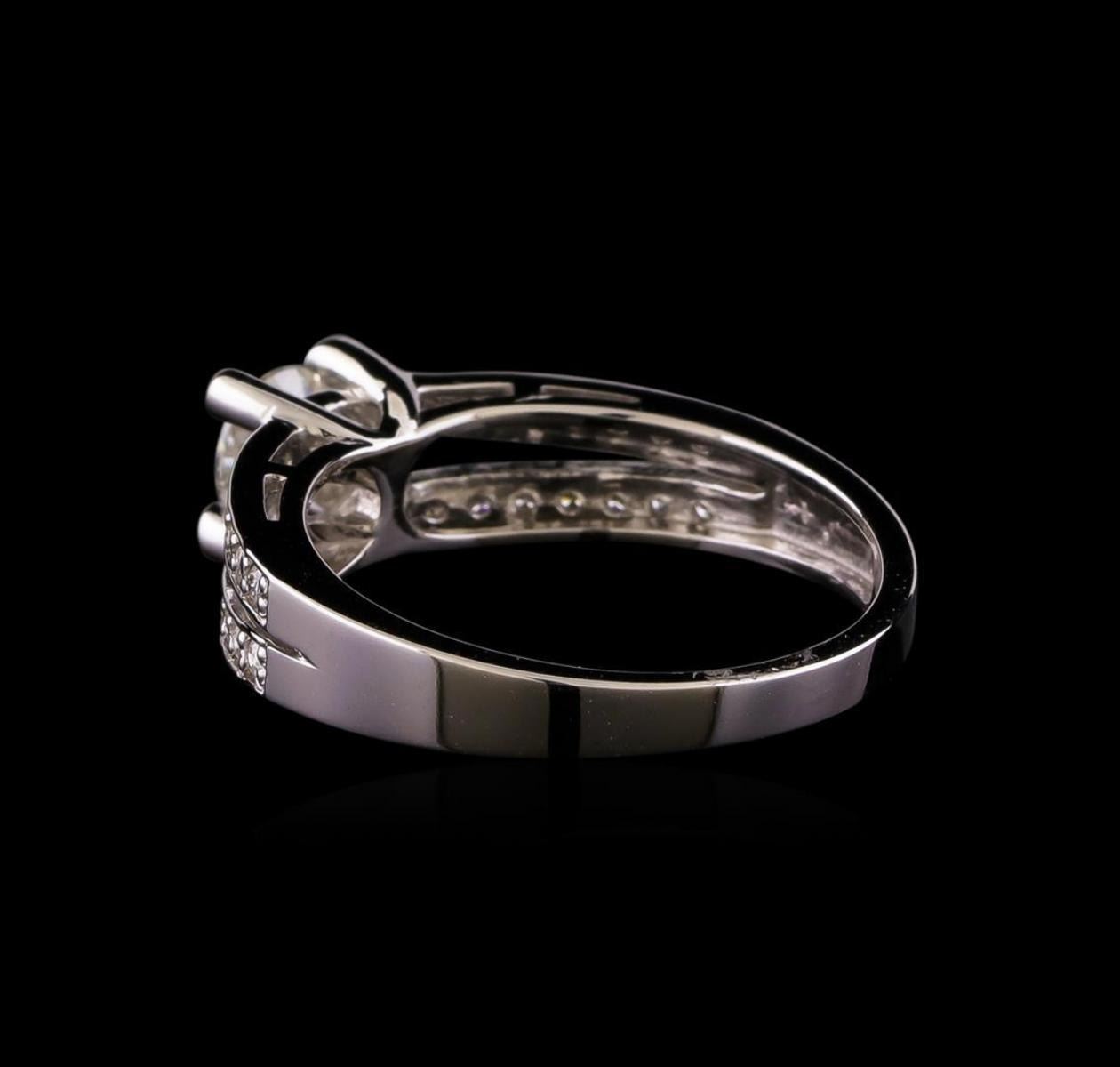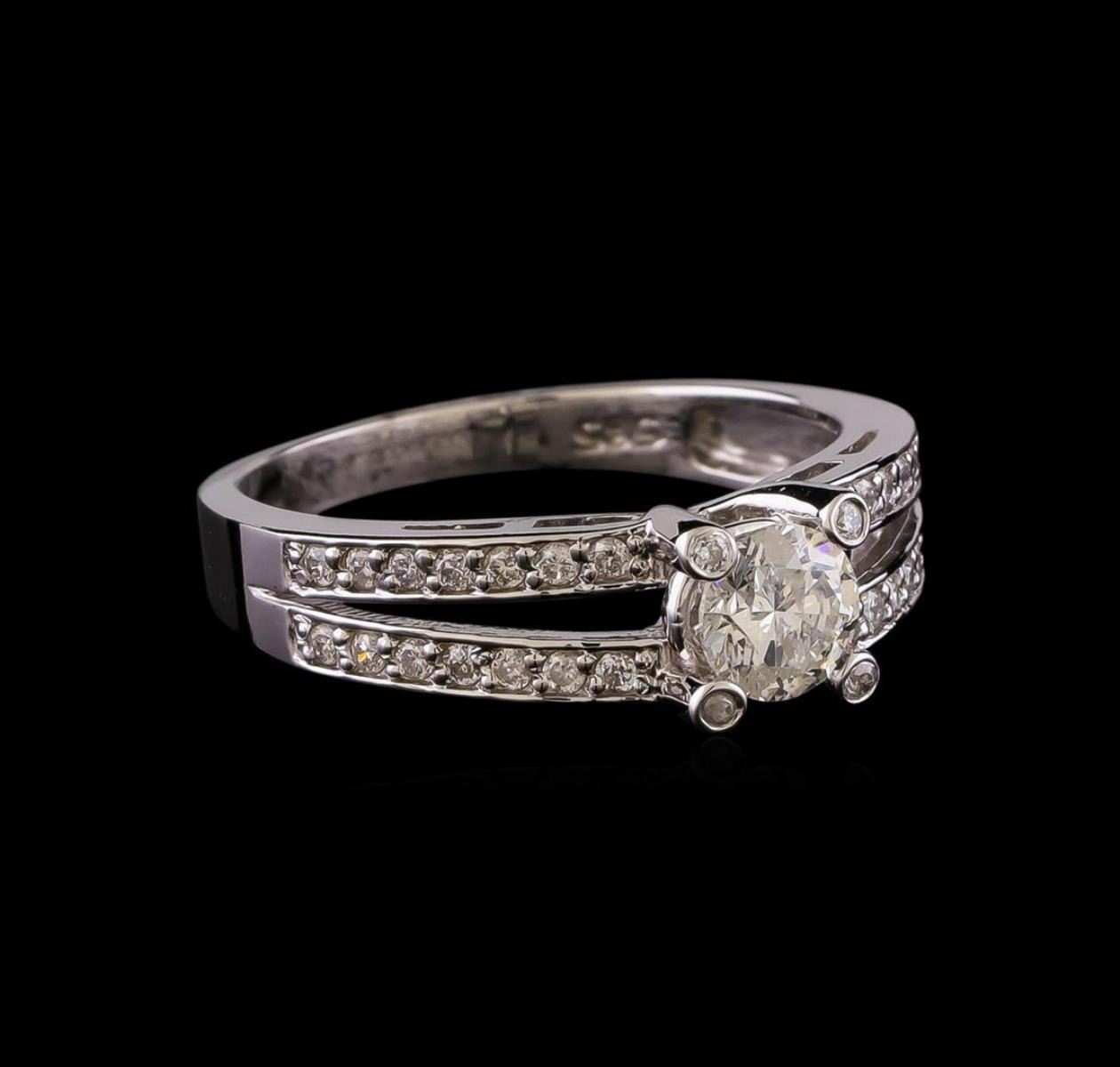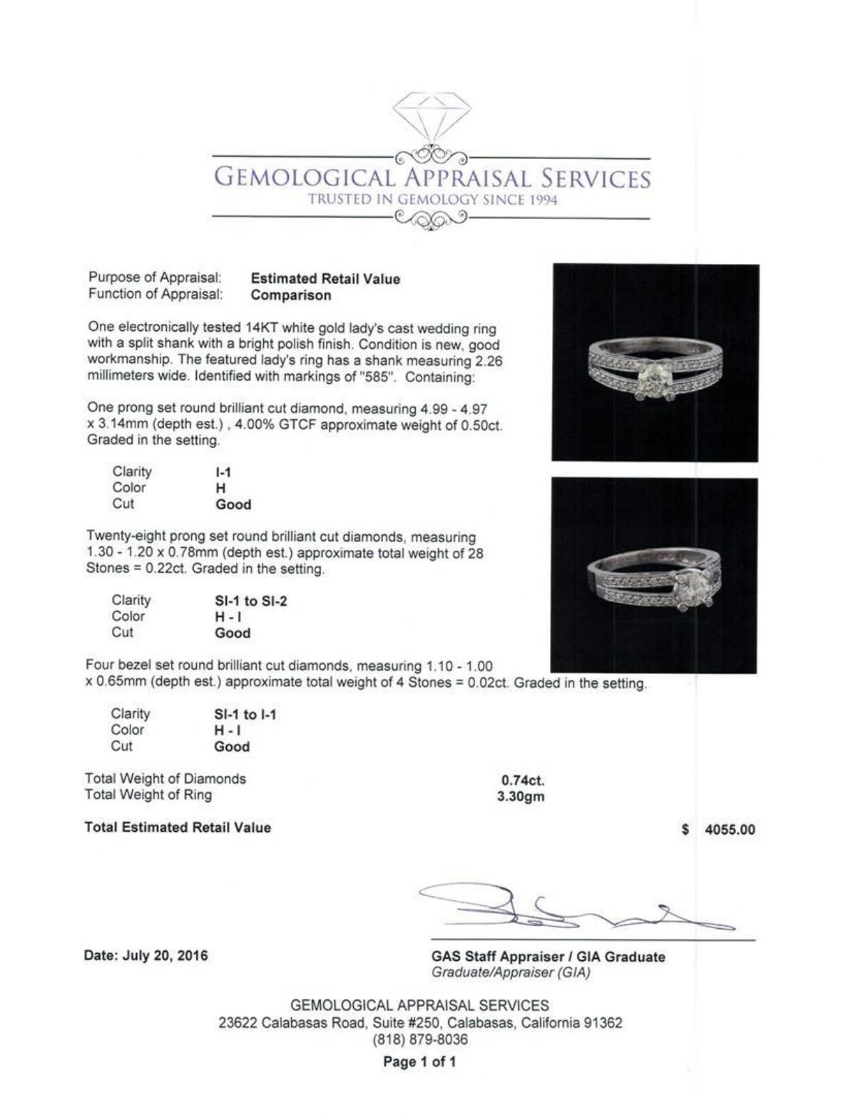 One electronically tested 14KT white gold lady's cast wedding ring with a split shank with a bright polish finish. The featured lady's ring has a shank measuring 2.26 millimeters wide. Identified with markings of '585'. Condition is new, good workmanship. Containing: One prong set round brilliant cut diamond, measuring 4.99 - 4.97 x 3.14mm (depth est.) , 4.00.%. GTCF approximate weight of 0.50ct. Graded in the setting. Clarity I-1. Color: H Cut Good Twenty-Eight prong set round brilliant cut diamonds, measuring 1.30 - 1.20 x 0.78mm (depth est.) approximate total weight of 28 Stones = 0.22ct. Graded in the setting. Clarity SI-1 to SI-2. Color: H - I Cut Good Four bezel set round brilliant cut diamonds, measuring 1.10 - 1.00 x 0.65mm (depth est.) approximate total weight of 4 Stones = 0.02ct. Graded in the setting. Clarity SI-1 to I-1. Color: H - I Cut Good. Total Weight of Diamonds 0.74ct.. Total Weight of Ring 3.30gm. GAS Appraised.