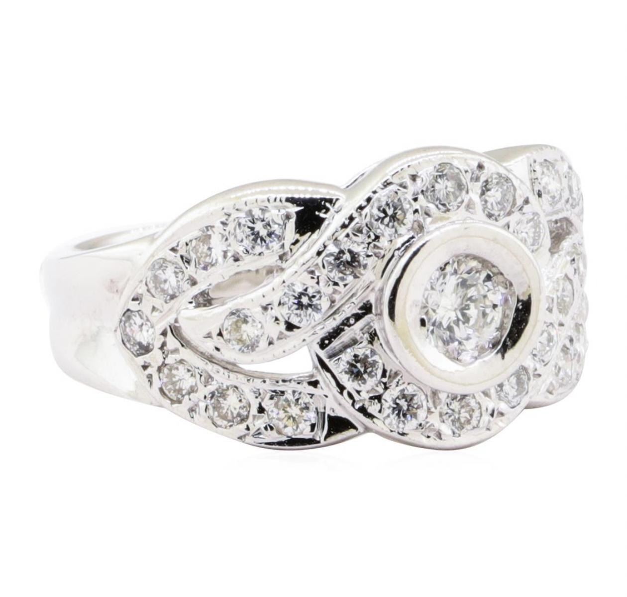 One electronically tested 14KT white gold lady's cast fashion ring with a bypass split shank with a bright polish finish. The featured lady's ring has a shank measuring 3.35 millimeters wide. Identified with markings of '14K'. Condition is Good. Containing: One prong set round brilliant cut diamond, measuring 3.60 - 3.55 x 2.15mm (depth est.) approximate weight of 0.17ct. Graded in the setting. Color H - I Clarity I-1 Cut Very Good Twenty-Eight prong set round brilliant cut diamonds, measuring 1.80 - 1.70 x 1.09mm (depth est.) approximate total weight of 28 Stones = 0.57ct. Graded in the setting. One diamond is chipped. Color H - I Clarity SI-1 to I-1 Cut Good. Total Weight of Diamonds 0.74ct.. Total Weight of Ring 4.90gm GAS Appraised at $2355.00. GAS Appraised.