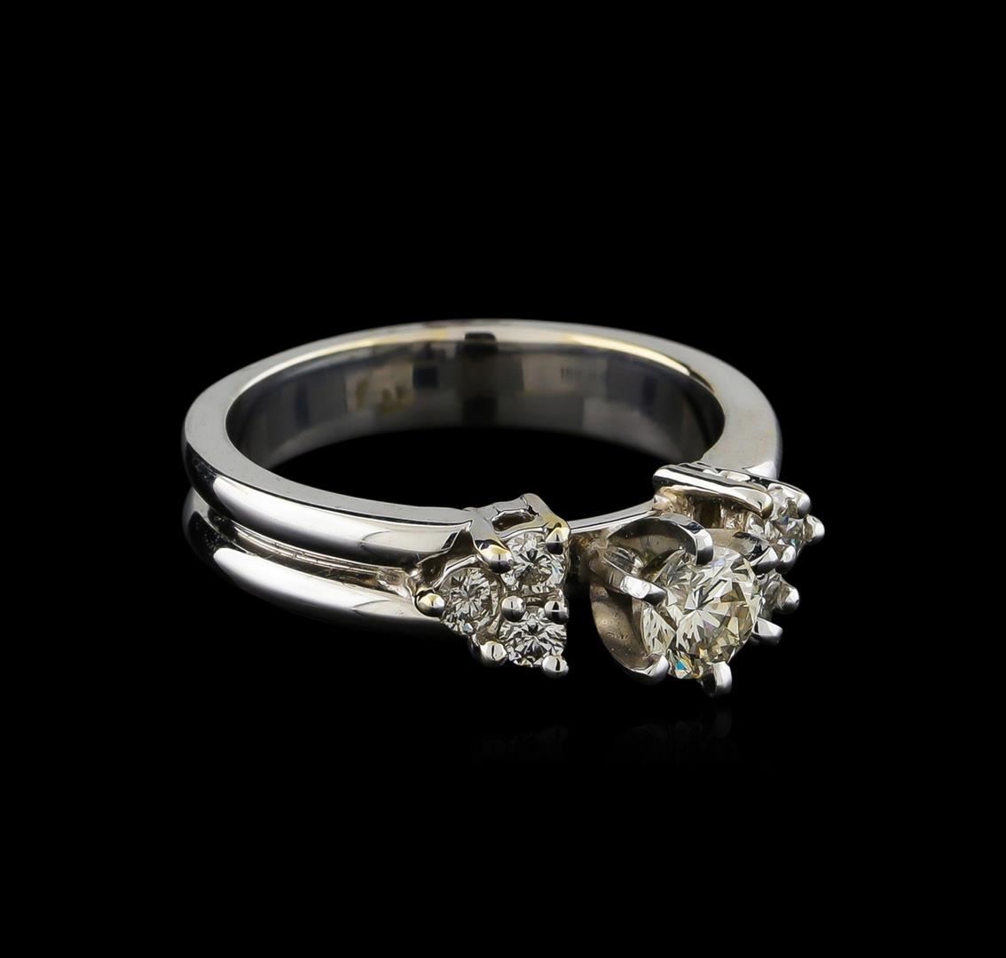 One electronically tested 18KT white gold lady's cast wedding ring with a cathedral shank with a bright polish finish. The featured lady's ring has a double shank measuring 3.78 millimeters wide. Identified with markings of "18K". Condition is new, good workmanship. Containing: One prong set round brilliant cut diamond, measuring 4.73 - 4.71 x 2.97mm (depth est.) approximate weight of 0.42ct. Graded in the setting. Clarity: SI-2. Color: J - Good Six prong set round brilliant cut diamonds, measuring 2.40 - 2.35 x 1.48mm (depth est.) approximate total weight of 6 Stones = 0.32ct. Graded in the setting. Clarity: SI-1 to SI-2. Color: H - I. Cut Good. Total Weight of Diamonds 0.74ct. Total Weight of Ring 6.50gm. GAS Appraised at $3,875.00.