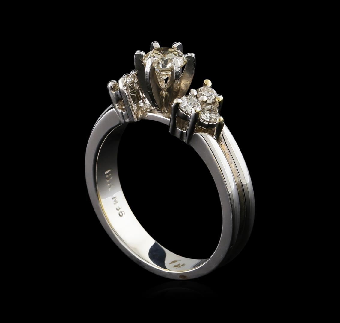 One electronically tested 18KT white gold lady's cast wedding ring with a cathedral shank with a bright polish finish. The featured lady's ring has a double shank measuring 3.78 millimeters wide. Identified with markings of "18K". Condition is new, good workmanship. Containing: One prong set round brilliant cut diamond, measuring 4.73 - 4.71 x 2.97mm (depth est.) approximate weight of 0.42ct. Graded in the setting. Clarity: SI-2. Color: J - Good Six prong set round brilliant cut diamonds, measuring 2.40 - 2.35 x 1.48mm (depth est.) approximate total weight of 6 Stones = 0.32ct. Graded in the setting. Clarity: SI-1 to SI-2. Color: H - I. Cut Good. Total Weight of Diamonds 0.74ct. Total Weight of Ring 6.50gm. GAS Appraised at $3,875.00.
