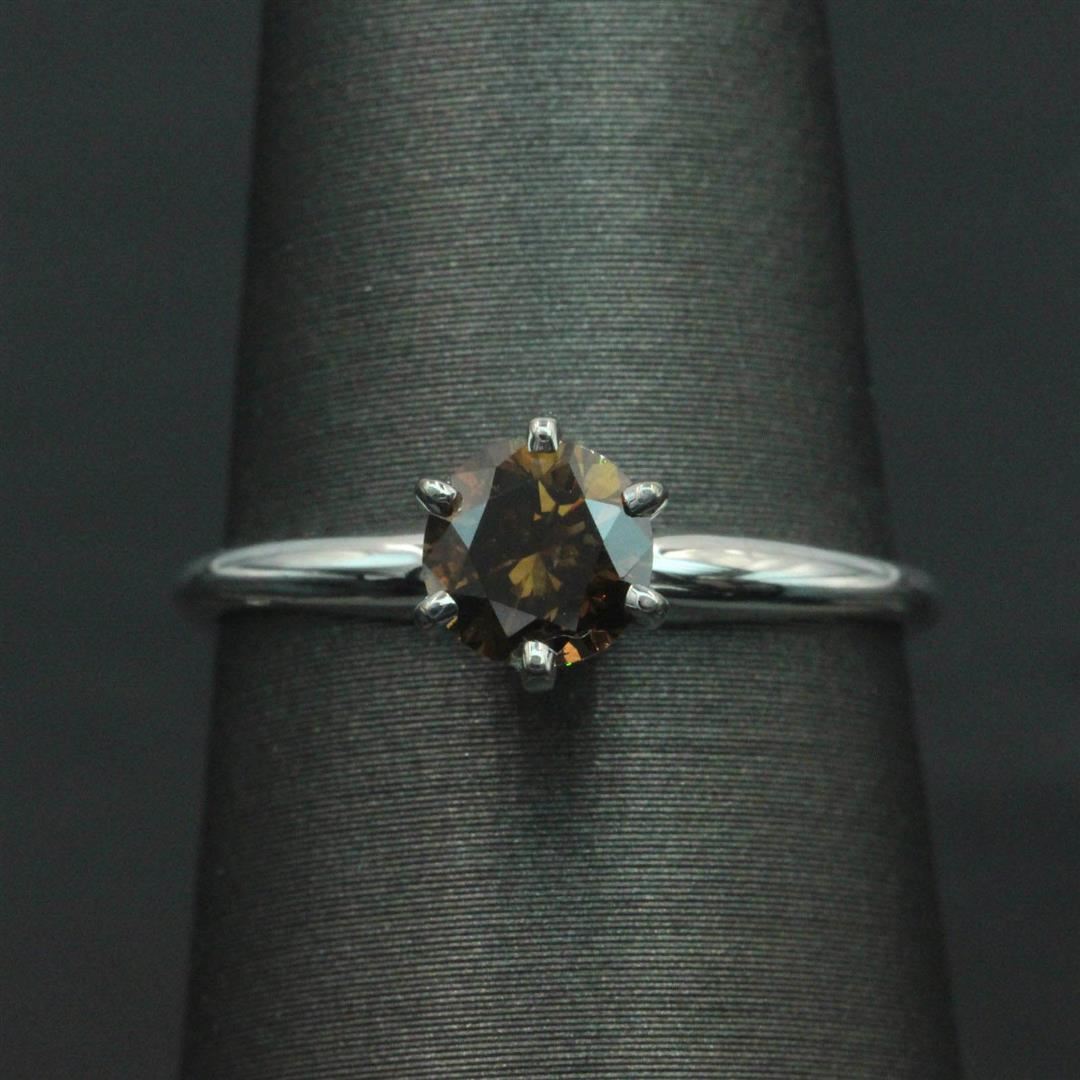 One lady's solitaire ring featuring: 14KT white gold weighing 1.77 grams containing one diamond weighing 0.74ct. The diamond is round brilliant cut and cognac in color with VS2 clarity and excellet cut. The ring is a size 6 but can be resized.