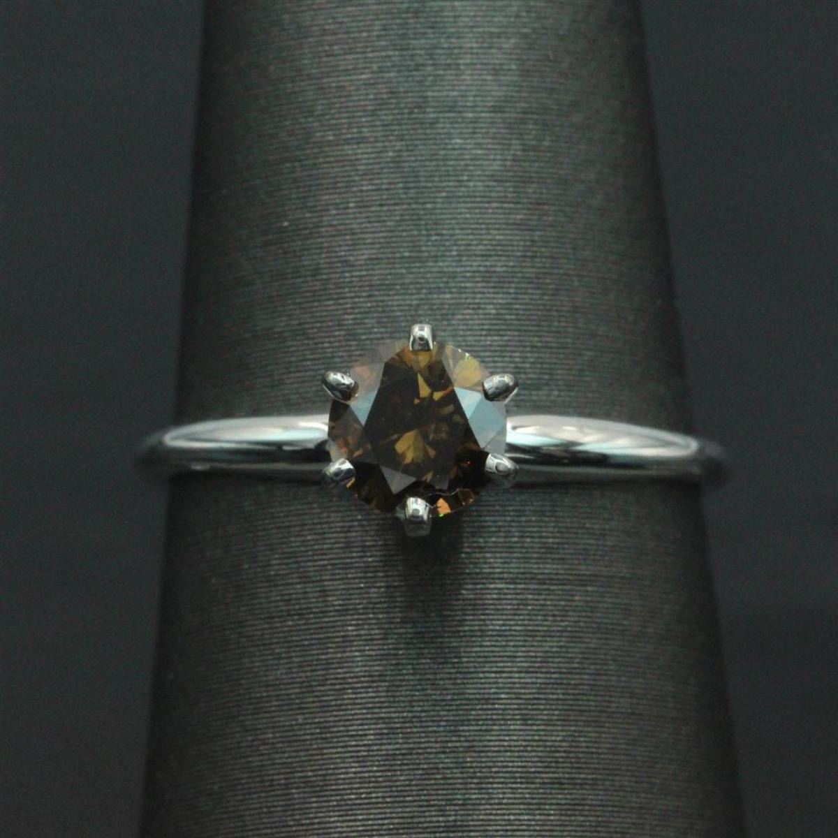 One lady's solitaire ring featuring: 14KT white gold weighing 1.77 grams containing one diamond weighing 0.74ct. The diamond is round brilliant cut and cognac in color with VS2 clarity and excellet cut. The ring is a size 6 but can be resized.