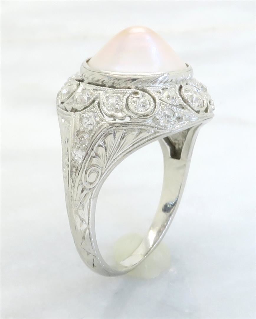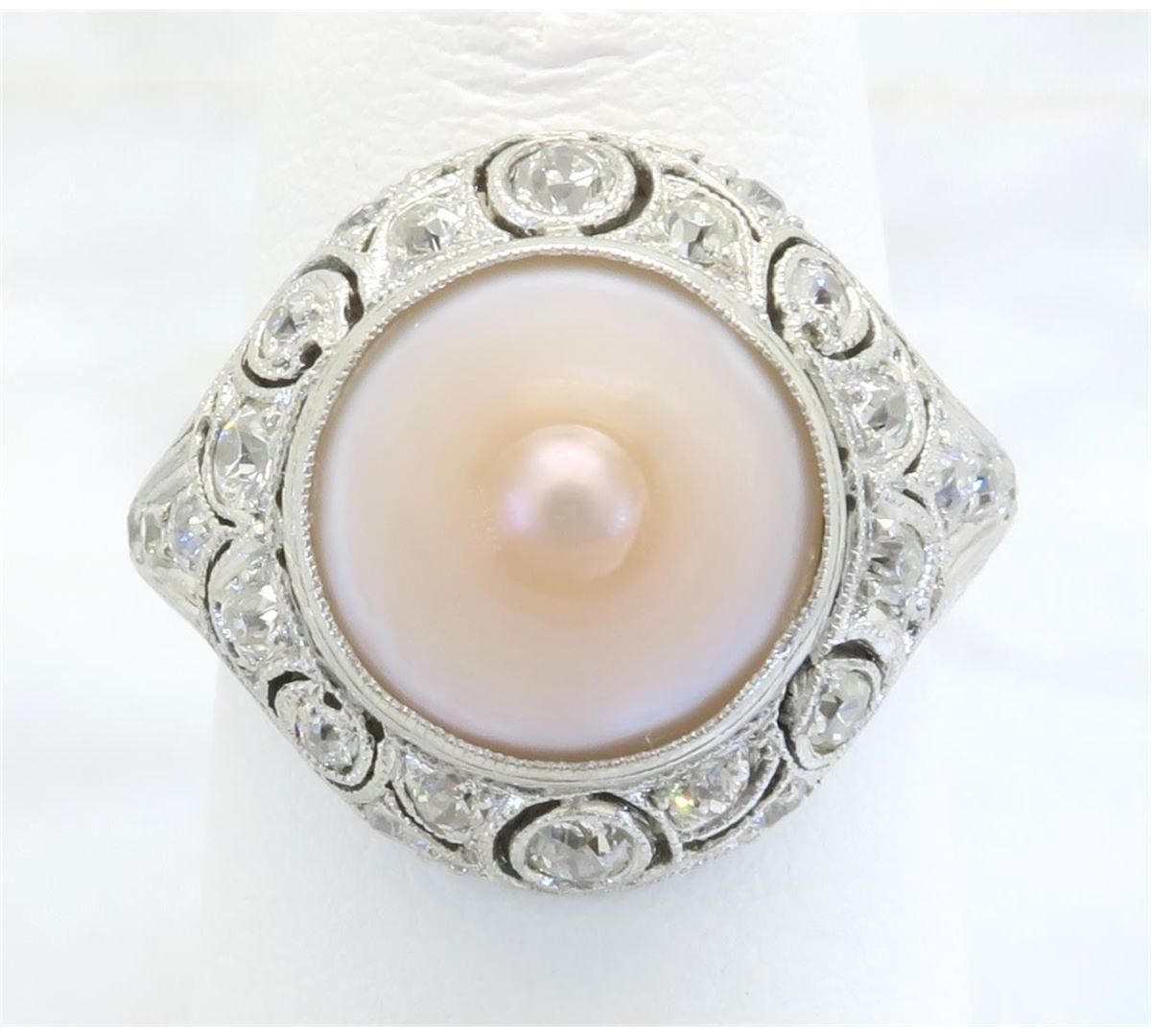 One tested Vintage Platinum Pearl and Diamond Ring Featuring: One 9.4MM X 9.3MM Pearl Containing: 24 European Cut Diamonds. The Total Approximate Diamond Weight: .74CTW. All diamonds graded as mounting permits unless otherwise stated. Weight of ring: 4.9 grams, Size: 3.75