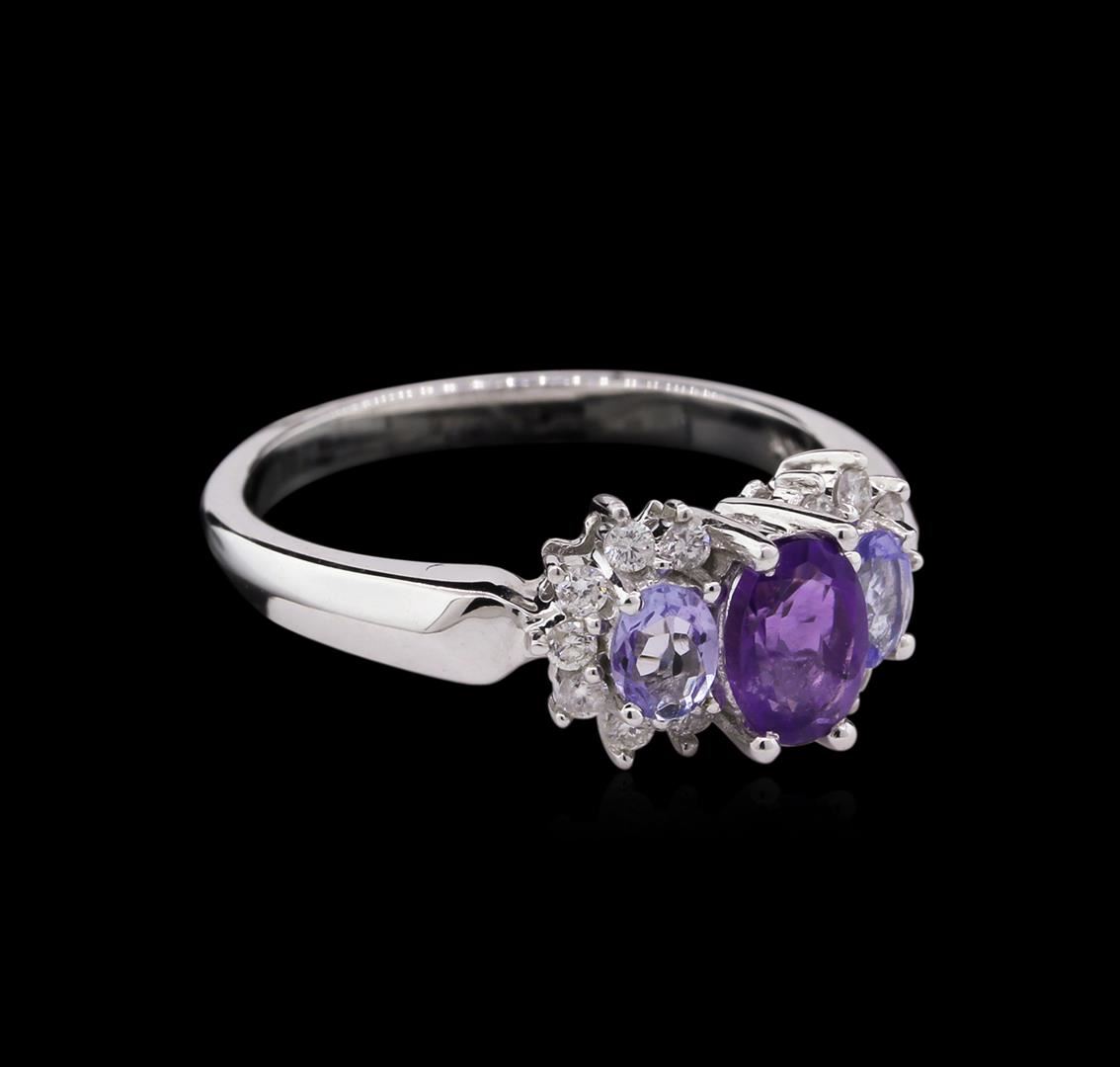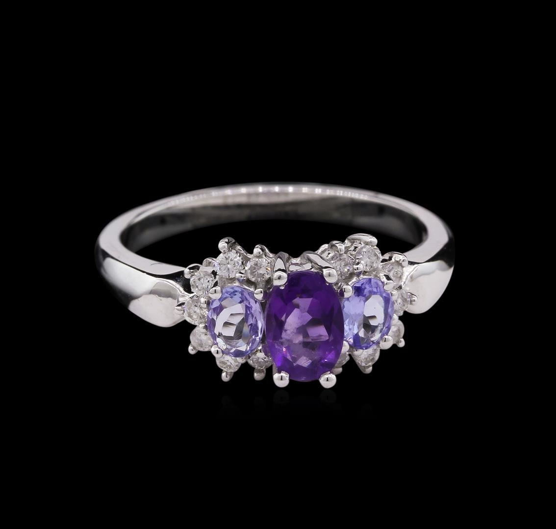 One ring featuring: 14KT white gold weighing 3.70 grams containing one amethyst center stone surrounded by two tanzanites on either side with a total weight of 0.74ct and diamonds with a total weight of 0.21ct.