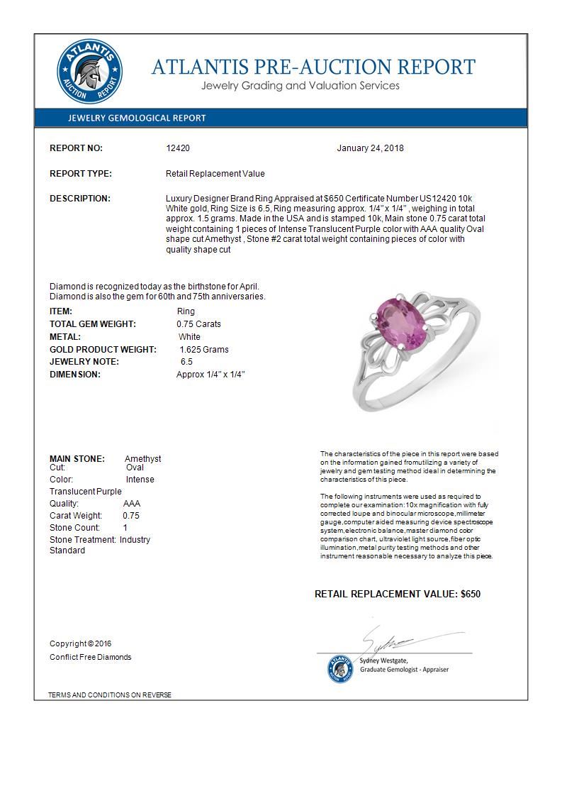REF-10W2F -12420 ---- 0.75 CTW Amethyst Ring 10K White Gold ---- Luxury Designer Brand Ring Appraised at $650 Certificate Number US12420 10k White gold, Ring Size is 6.5, Ring measuring approx. 1/4" x 1/4" , weighing in total approx. 1.5 grams. Made in the USA and is stamped 10k, Main stone 0.75 carat total weight containing 1 pieces of Intense Translucent Purple color with AAA quality Oval shape cut Amethyst , Stone #2 carat total weight containing pieces of color with quality shape cut