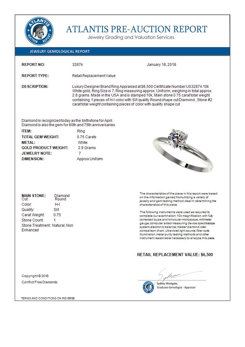 REF-118M2H -32874 ---- 0.75 CTW Certified H-SI/I Quality Diamond Solitaire Engagement Ring 10K White Gold ---- Luxury Designer Brand Ring Appraised at $6,500 Certificate Number US32874 10k White gold, Ring Size is 7, Ring measuring approx. Uniform, weighing in total approx. 2.8 grams. Made in the USA and is stamped 10k, Main stone 0.75 carat total weight containing 1 pieces of H-I color with SI/I quality Round shape cut Diamond , Stone #2 carat total weight containing pieces of color with quality shape cut