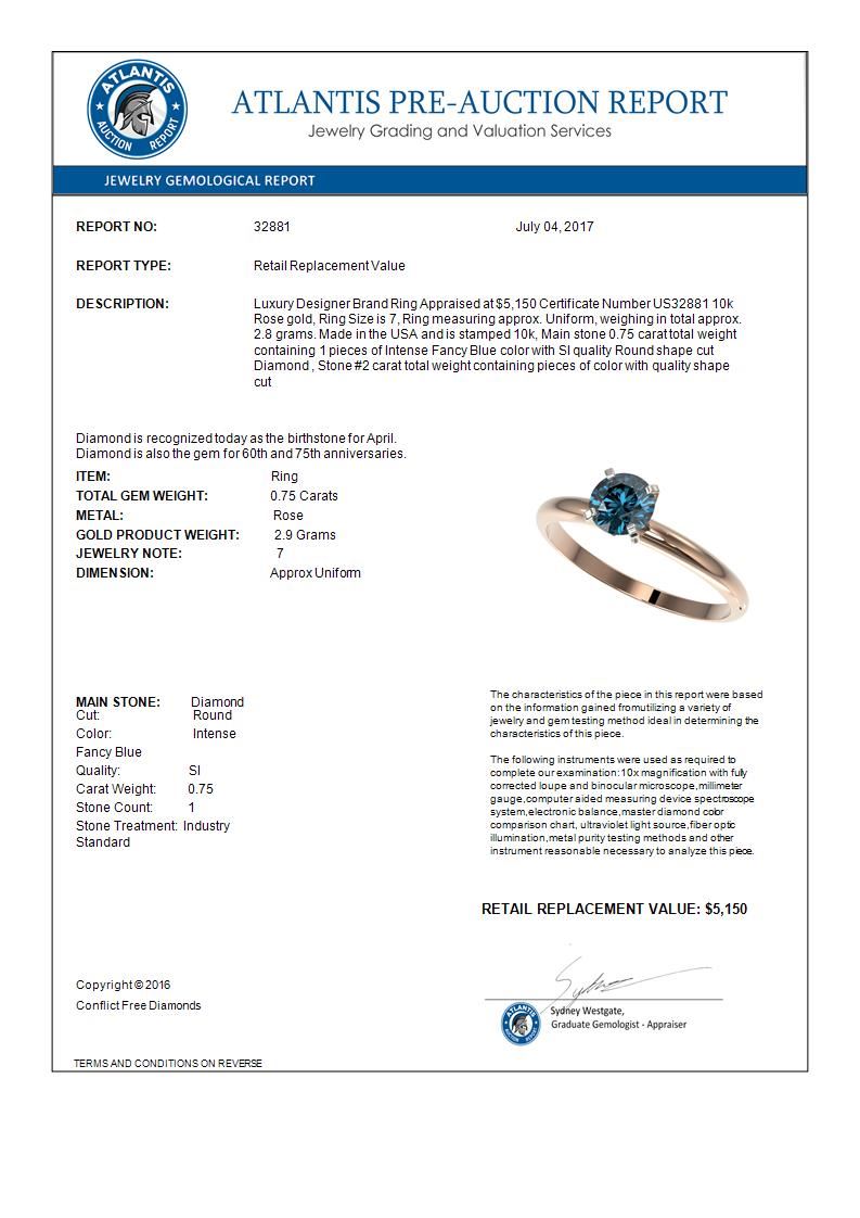 0.75 CTW Certified Intense Blue SI Diamond Solitaire Engagement Ring 10K Rose Gold ---- Luxury Designer Brand Ring Appraised Retail Price at $5,150 ---- SKU Number US32881 10k Rose gold Ring Size is 7, Ring measuring approx. Uniform, weighing in total approx. 2.8 grams. Made in the USA and is stamped 10k, Main stone 0.75 carat total weight containing 1 pieces of Intense Fancy Blue color with SI quality Round shape cut Diamond , Stone #2 carat total weight containing pieces of color with quality shape cut