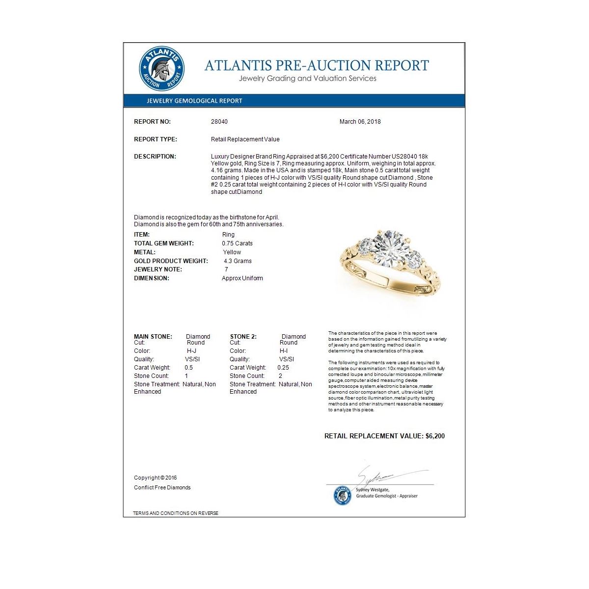 Total Gem weight: 0.75 carats
