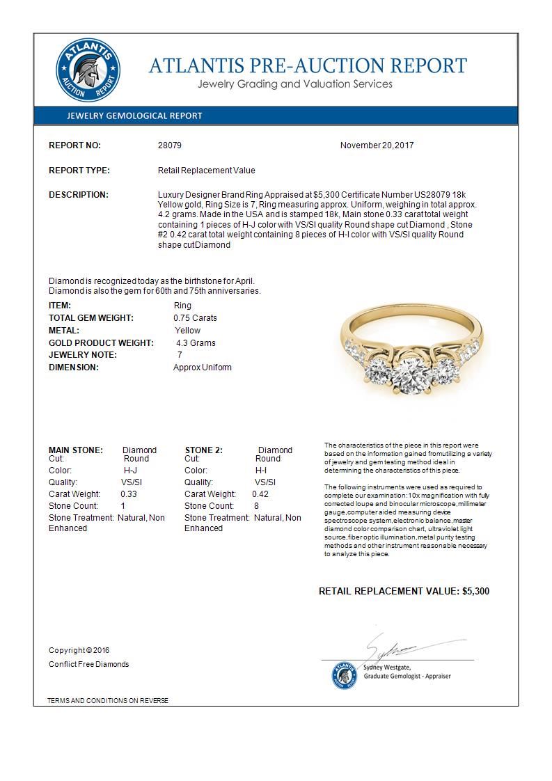 28079 - REF-96M2F ---- 0.75 CTW Certified VS/SI Diamond 3 Stone Ring 18K Yellow Gold ---- Luxury Designer Brand Ring Appraised at $5,300 Certificate Number US28079 18k Yellow gold, Ring Size is 7, Ring measuring approx. Uniform, weighing in total approx. 4.2 grams. Made in the USA and is stamped 18k, Main stone 0.33 carat total weight containing 1 pieces of H-J color with VS/SI quality Round shape cut Diamond , Stone #2 0.42 carat total weight containing 8 pieces of H-I color with VS/SI quality Round shape cut Diamond