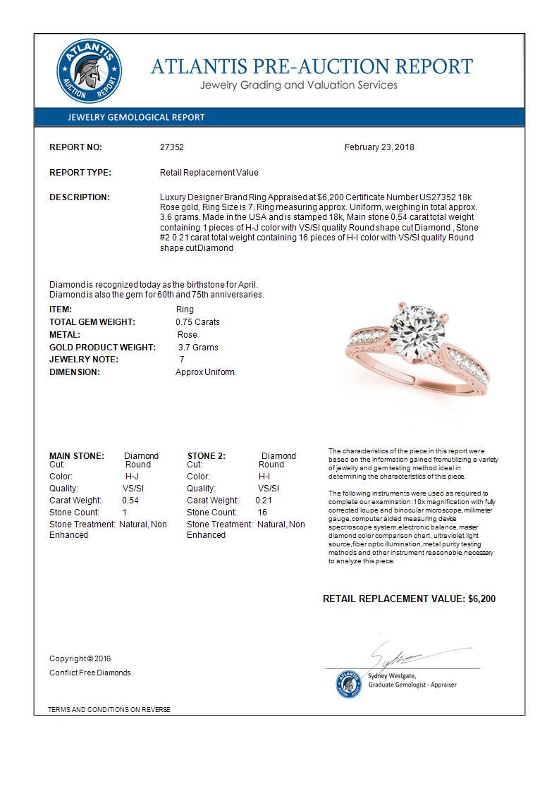 REF-112W8F -27352 ---- 0.75 CTW Certified VS/SI Diamond Solitaire Antique Ring 18K Rose Gold ---- Luxury Designer Brand Ring Appraised at $6,200 Certificate Number US27352 18k Rose gold, Ring Size is 7, Ring measuring approx. Uniform, weighing in total approx. 3.6 grams. Made in the USA and is stamped 18k, Main stone 0.54 carat total weight containing 1 pieces of H-J color with VS/SI quality Round shape cut Diamond , Stone #2 0.21 carat total weight containing 16 pieces of H-I color with VS/SI quality Round shape cut Diamond