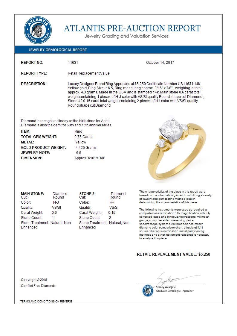 11631 - REF-119H5M ---- 0.75 CTW Certified VS/SI Diamond Solitaire Ring 14K Yellow Gold ---- Luxury Designer Brand Ring Appraised at $5,250 Certificate Number US11631 14k Yellow gold, Ring Size is 6.5, Ring measuring approx. 3/16" x 3/8" , weighing in total approx. 4.3 grams. Made in the USA and is stamped 14k, Main stone 0.6 carat total weight containing 1 pieces of H-J color with VS/SI quality Round shape cut Diamond , Stone #2 0.15 carat total weight containing 2 pieces of H-I color with VS/SI quality Round shape cut Diamond