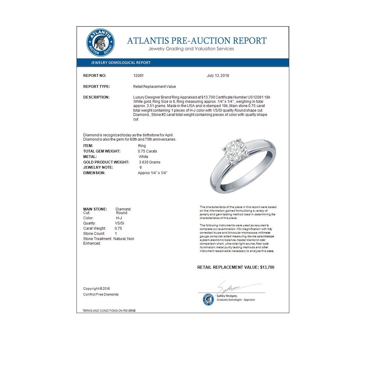 REF-356A2X -12081 ---- 0.75 CTW Certified VS/SI Diamond Solitaire Ring 18K White Gold ---- Luxury Designer Brand Ring Appraised at $13,700 Certificate Number US12081 18k White gold, Ring Size is 6, Ring measuring approx. 1/4" x 1/4" , weighing in total approx. 3.51 grams. Made in the USA and is stamped 18k, Main stone 0.75 carat total weight containing 1 pieces of H-J color with VS/SI quality Round shape cut Diamond , Stone #2 carat total weight containing pieces of color with quality shape cut