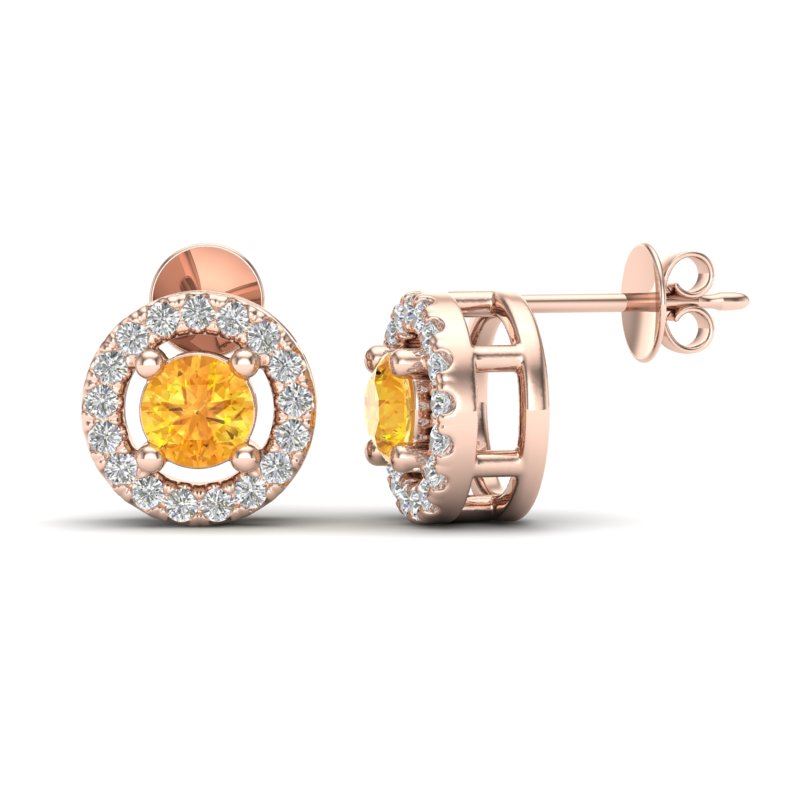 REF-33W8F -20057 ---- 0.75 CTW Citrine & Micro Pave VS/SI Diamond Earrings Solitaire Halo 14K Rose Gold ---- Luxury Designer Brand Earring Appraised at $2,050 Certificate Number US20057 14k Rose gold, Earring Size is 5/16 Inches, Earring measuring approx. 5/16" X 5/16" , weighing in total approx. 3 grams. Made in the USA and is stamped 14k, Main stone 0.5 carat total weight containing 2 pieces of Translucent Yellow color with AAA quality Round shape cut Citrine , Stone #2 0.25 carat total weight containing 34 pieces of H-I color with VS/SI quality Round shape cut Diamond