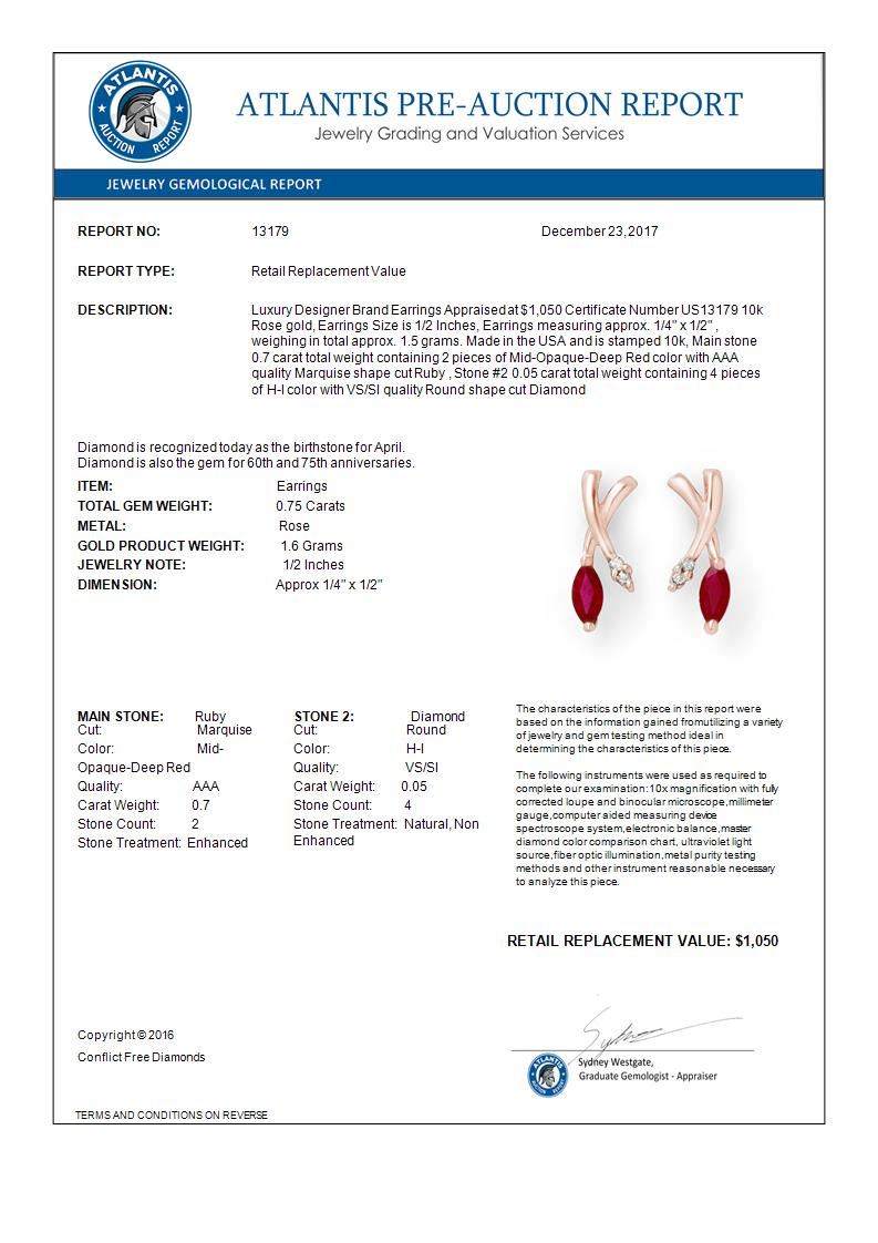 REF-15M8H -13179 ---- 0.75 CTW Ruby & Diamond Earrings 10K Rose Gold ---- Luxury Designer Brand Earrings Appraised at $1,050 Certificate Number US13179 10k Rose gold, Earrings Size is 1/2 Inches, Earrings measuring approx. 1/4" x 1/2" , weighing in total approx. 1.5 grams. Made in the USA and is stamped 10k, Main stone 0.7 carat total weight containing 2 pieces of Mid-Opaque-Deep Red color with AAA quality Marquise shape cut Ruby , Stone #2 0.05 carat total weight containing 4 pieces of H-I color with VS/SI quality Round shape cut Diamond
