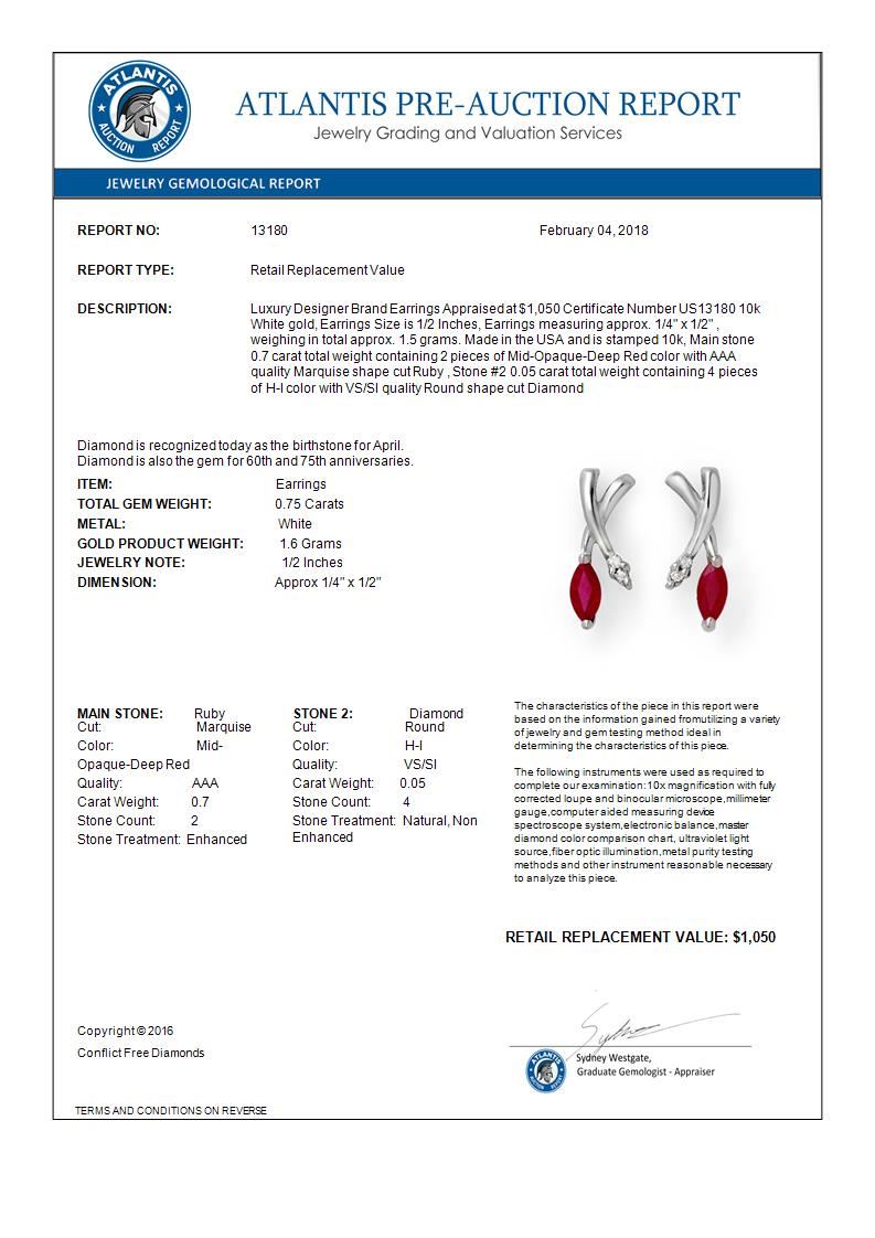 REF-15N8Y -13180 ---- 0.75 CTW Ruby & Diamond Earrings 10K White Gold ---- Luxury Designer Brand Earrings Appraised at $1,050 Certificate Number US13180 10k White gold, Earrings Size is 1/2 Inches, Earrings measuring approx. 1/4" x 1/2" , weighing in total approx. 1.5 grams. Made in the USA and is stamped 10k, Main stone 0.7 carat total weight containing 2 pieces of Mid-Opaque-Deep Red color with AAA quality Marquise shape cut Ruby , Stone #2 0.05 carat total weight containing 4 pieces of H-I color with VS/SI quality Round shape cut Diamond