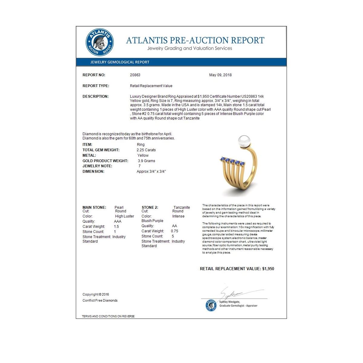 REF-27M3H -20863 ---- 0.75 CTW Tanzanite & White Pearl Designer Ring 14K Yellow Gold ---- Luxury Designer Brand Ring Appraised at $1,950 Certificate Number US20863 14k Yellow gold, Ring Size is 7, Ring measuring approx. 3/4" x 3/4", weighing in total approx. 3.5 grams. Made in the USA and is stamped 14k, Main stone 1.5 carat total weight containing 1 pieces of High Luster color with AAA quality Round shape cut Pearl , Stone #2 0.75 carat total weight containing 5 pieces of Intense Blusih Purple color with AA quality Round shape cut Tanzanite