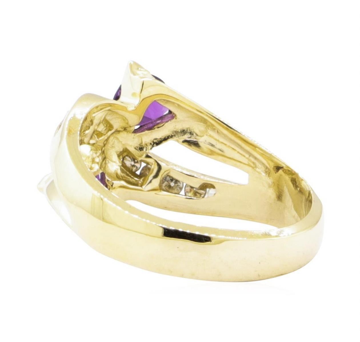 One ring featuring: 14KT yellow gold weighing 5.5 grams containing two amethysts weighing 0.50ctw and diamonds weighing 0.25ctw.