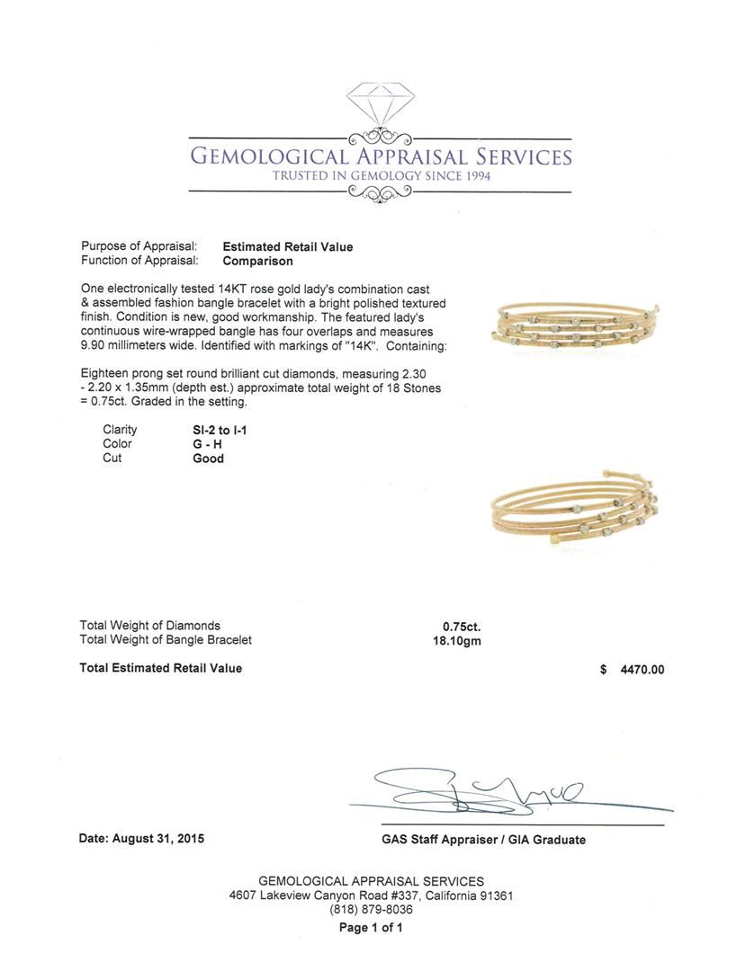 One electronically tested 14KT rose gold lady's combination cast & assembled fashion bangle bracelet with a bright polished textured finish. The featured lady's continuous wire-wrapped bangle has four overlaps and measures 9.90 millimeters wide. Identified with markings of "14K". Condition is new, good workmanship. Containing: Eighteen prong set round brilliant cut diamonds, measuring 2.30 - 2.20 x 1.35mm (depth est.) approximate total weight of 18 Stones = 0.75ct. Graded in the setting. Clarity: SI-2 to I-1. Color: G - Good. Total Weight of Diamonds 0.75ct. Total Weight of Bangle Bracelet 18.10gm. GAS Appraised at $4,470.00.