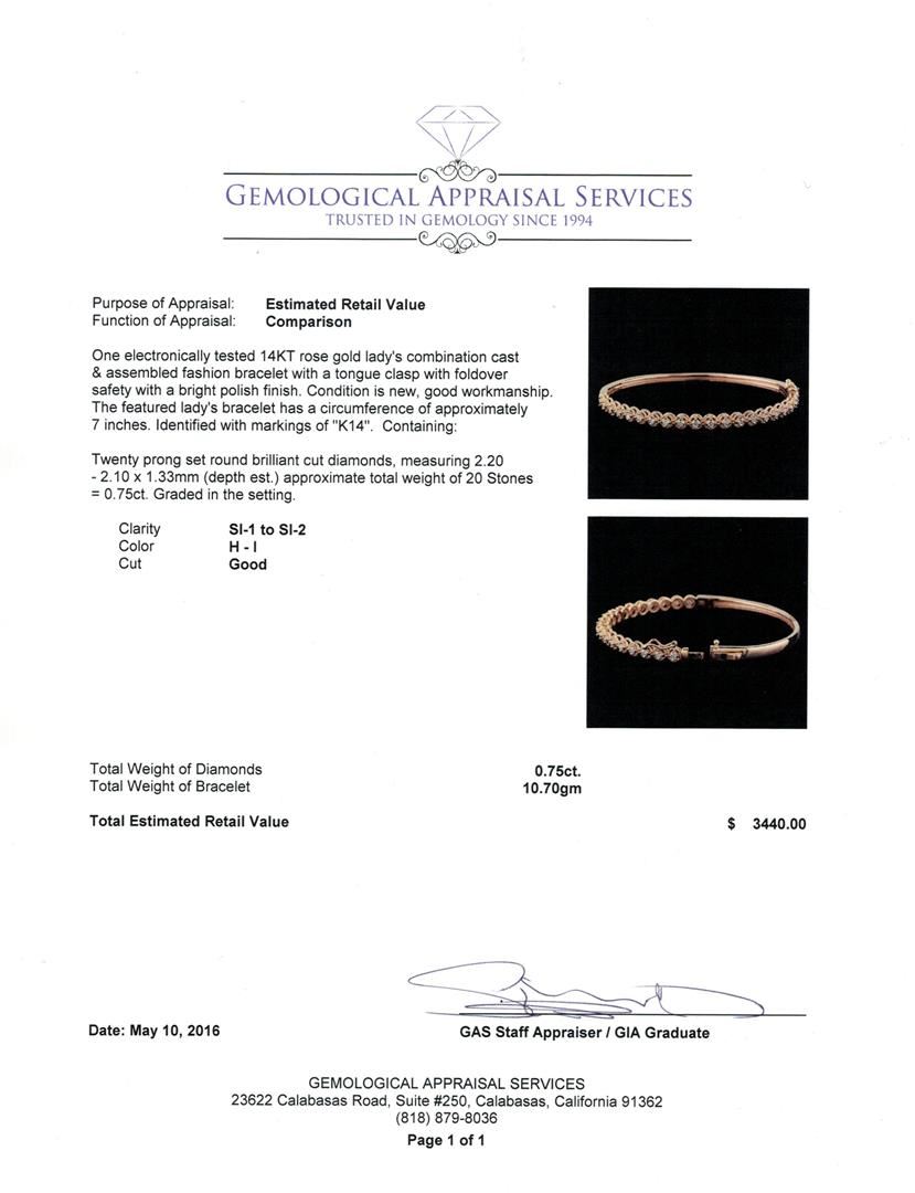 One electronically tested 14KT rose gold lady's combination cast & assembled fashion bracelet with a tongue clasp with foldover safety with a bright polish finish. The featured lady's bracelet has a circumference of approximately 7 inches. Identified with markings of "K14". Condition is new, good workmanship. Containing: Twenty prong set round brilliant cut diamonds, measuring 2.20 - 2.10 x 1.33mm (depth est.) approximate total weight of 20 Stones = 0.75ct. Graded in the setting. Clarity: SI-1 to SI-2. Color: H - I. Cut Good. Total Weight of Diamonds 0.75ct. Total Weight of Bracelet 10.70gm. GAS Appraised at $3,440.00.