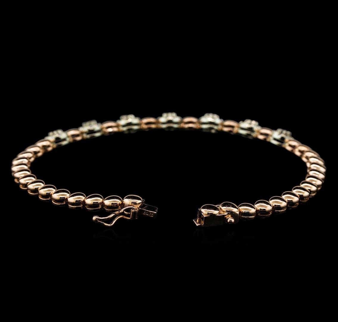 One electronically tested 14KT rose and white gold lady's combination cast & assembled fashion bracelet with a tongue clasp with a bright polish finish. The featured lady's bracelet measures 7 inches in length. Identified with markings of 'K14'. Condition is new, good workmanship. Containing: Seven prong set round brilliant cut diamonds, measuring 2.30 - 2.25 x 1.41mm (depth est.) approximate total weight of 7 Stones = 0.32ct. Graded in the setting. Clarity VS-2 to SI-1. Color: H - I Cut Good Sixty-Five prong set round brilliant cut diamonds, measuring 1.25 - 1.15 x 0.74mm (depth est.) approximate total weight of 65 Stones = 0.43ct. Graded in the setting. Clarity SI-1 to I-1. Color: H - I Cut Good. Total Weight of Diamonds 0.75ct.. Total Weight of Bracelet 10.50gm GAS Appraised at $4,130.00.