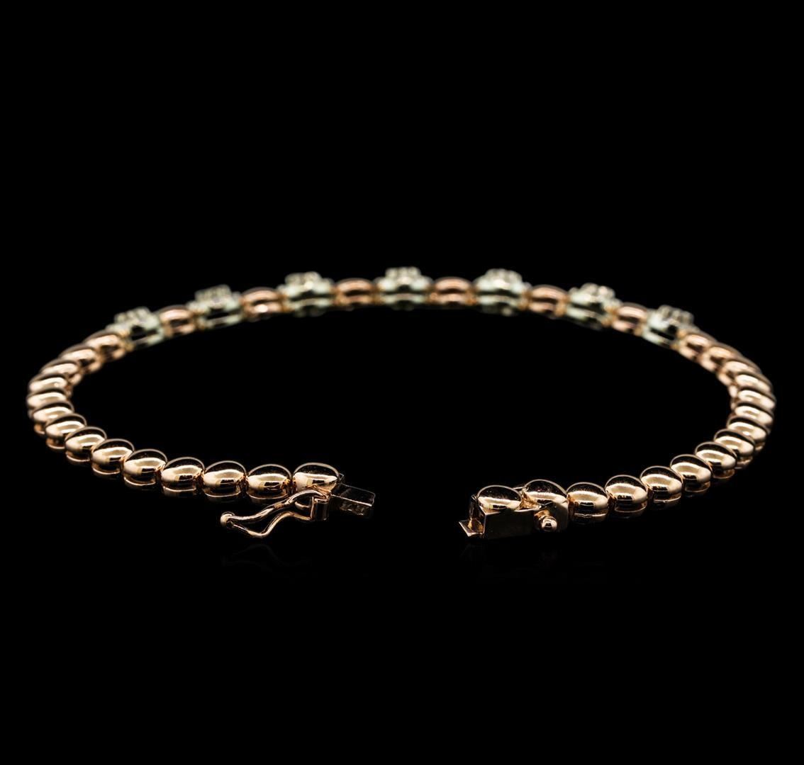 One electronically tested 14KT rose and white gold lady's combination cast & assembled fashion bracelet with a tongue clasp with a bright polish finish. The featured lady's bracelet measures 7 inches in length. Identified with markings of 'K14'. Condition is new, good workmanship. Containing: Seven prong set round brilliant cut diamonds, measuring 2.30 - 2.25 x 1.41mm (depth est.) approximate total weight of 7 Stones = 0.32ct. Graded in the setting. Clarity VS-2 to SI-1. Color: H - I Cut Good Sixty-Five prong set round brilliant cut diamonds, measuring 1.25 - 1.15 x 0.74mm (depth est.) approximate total weight of 65 Stones = 0.43ct. Graded in the setting. Clarity SI-1 to I-1. Color: H - I Cut Good. Total Weight of Diamonds 0.75ct.. Total Weight of Bracelet 10.50gm GAS Appraised.