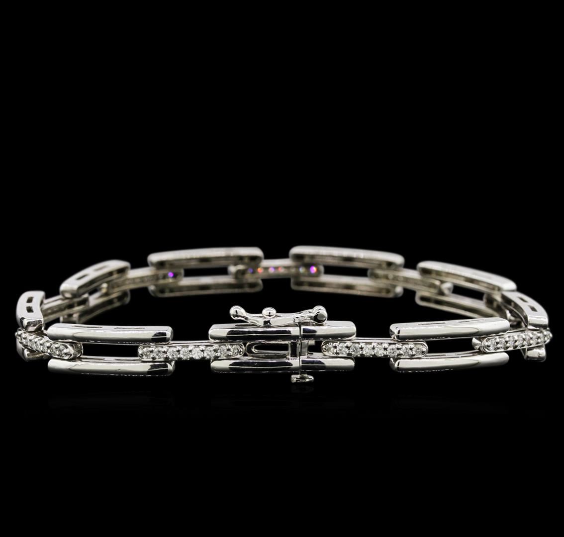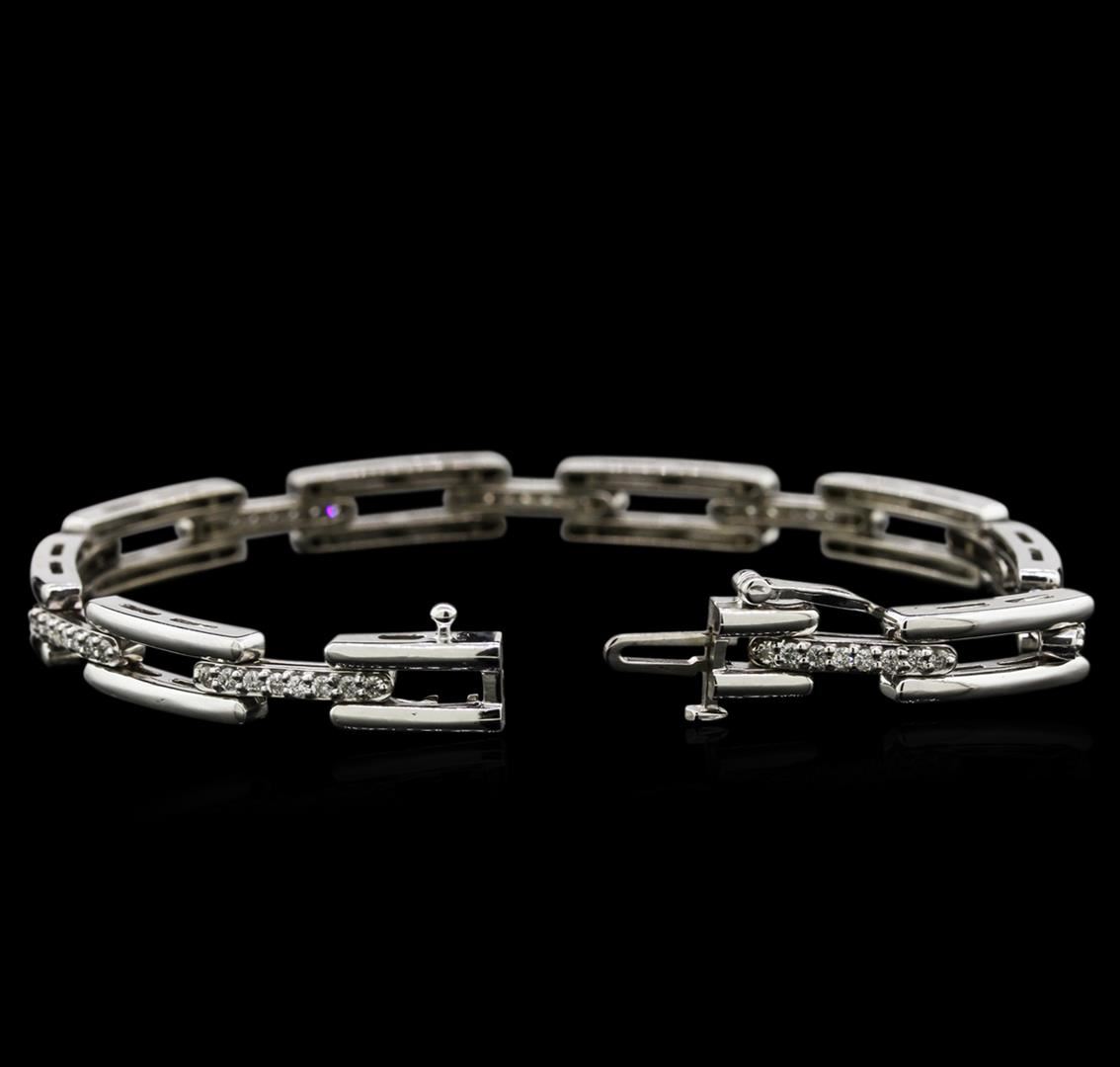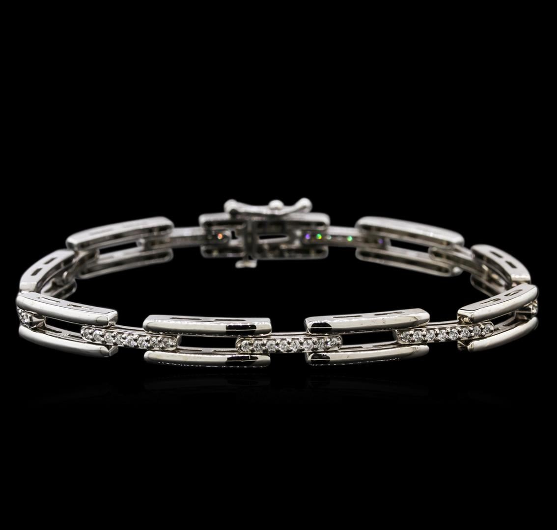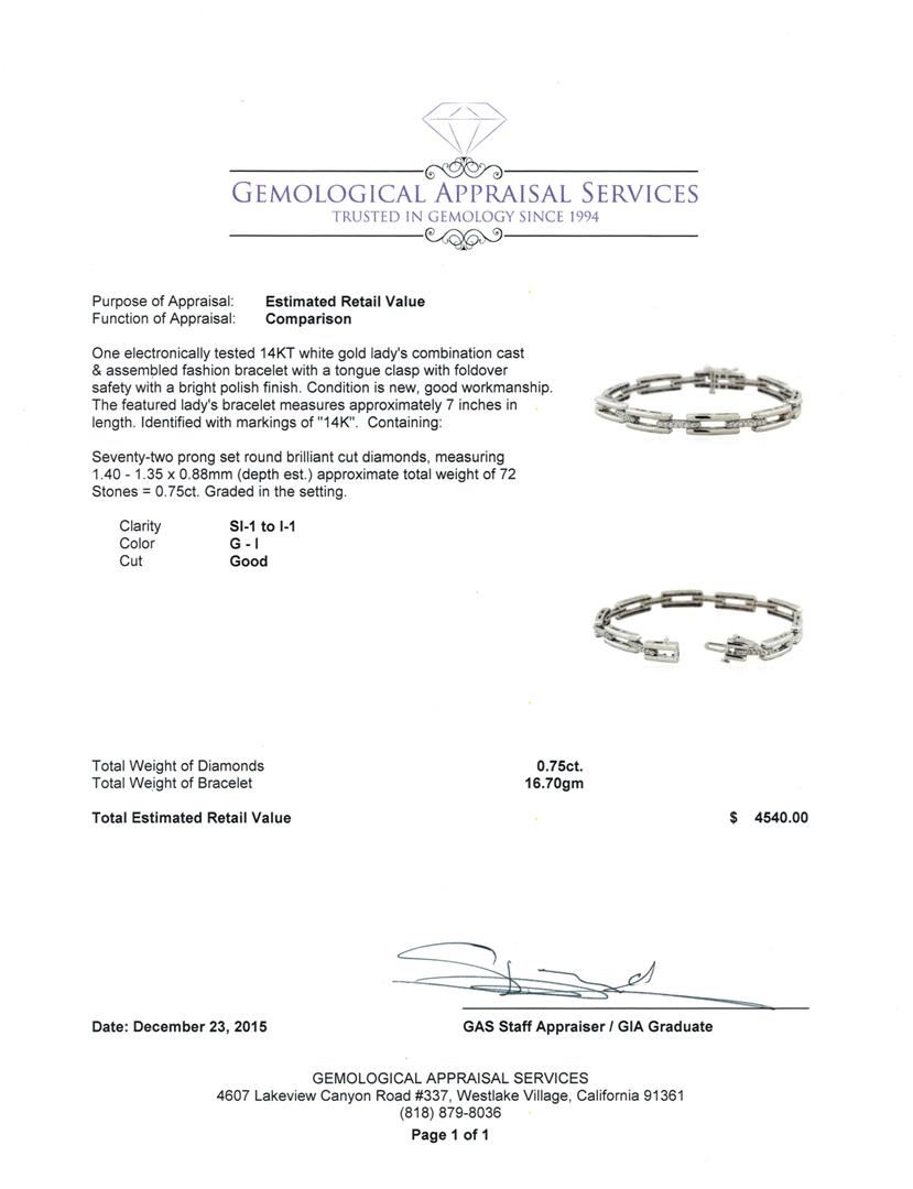 One electronically tested 14KT white gold lady's combination cast & assembled fashion bracelet with a tongue clasp with foldover safety with a bright polish finish. The featured lady's bracelet measures approximately 7 inches in length. Identified with markings of "14K". Condition is new, good workmanship. Containing: Seventy-Two prong set round brilliant cut diamonds, measuring 1.40 - 1.35 x 0.88mm (depth est.) approximate total weight of 72 Stones = 0.75ct. Graded in the setting. Clarity: SI-1 to I-1. Color: G - I. Cut Good. Total Weight of Diamonds 0.75ct. Total Weight of Bracelet 16.70gm. GAS Appraised at $4,540.00.