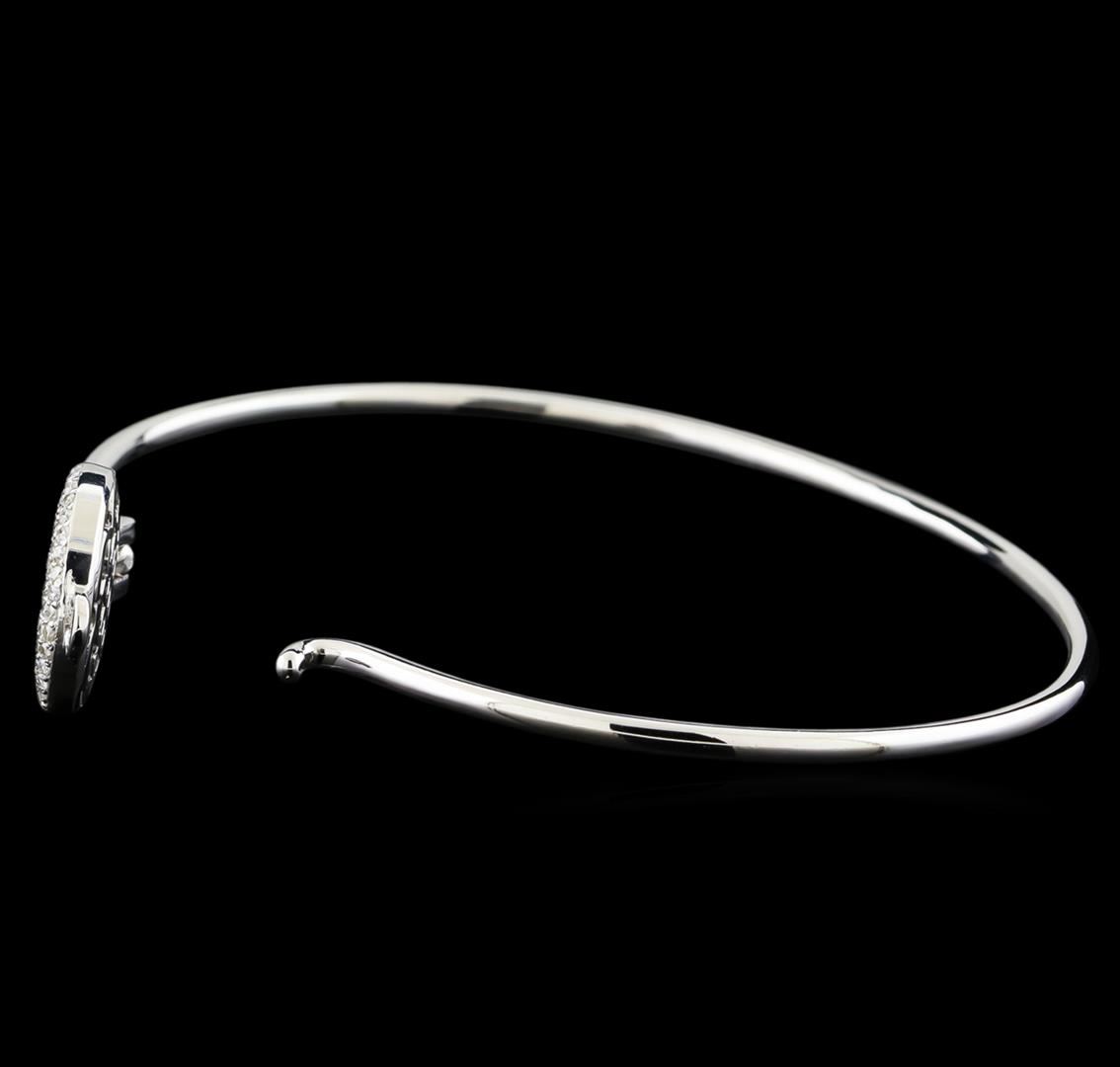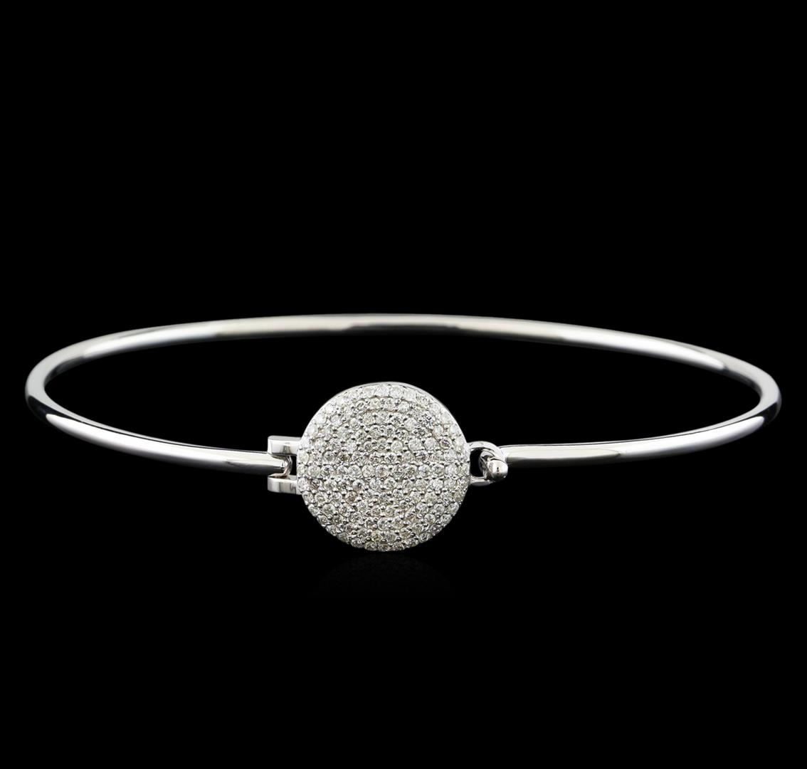 One electronically tested 14KT white gold lady's combination cast & assembled fashion bangle bracelet with a foldover clasp with a bright polish finish. The featured lady's bangle bracelet has a circumference of approximately 7 inches. Condition is new, good workmanship. Containing: One Hundred Twenty-Eight prong set round brilliant cut diamonds, measuring 1.20 - 1.10 x 0.71mm (depth est.) approximate total weight of 128 Stones = 0.75ct. Graded in the setting. Clarity: SI-1 to SI-2. Color: G - Good. Total Weight of Diamonds 0.75ct. Total Weight of Bangle Bracelet 9.90gm