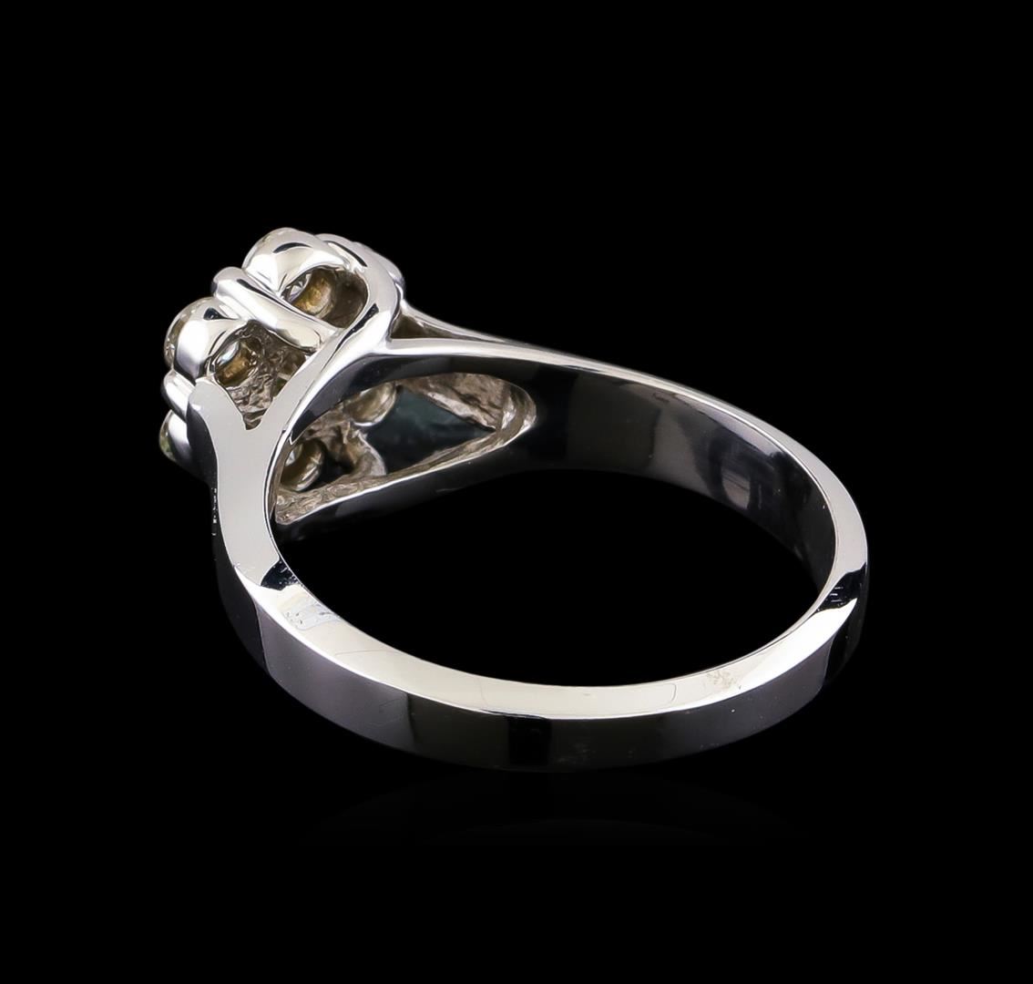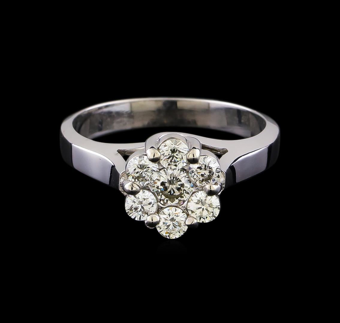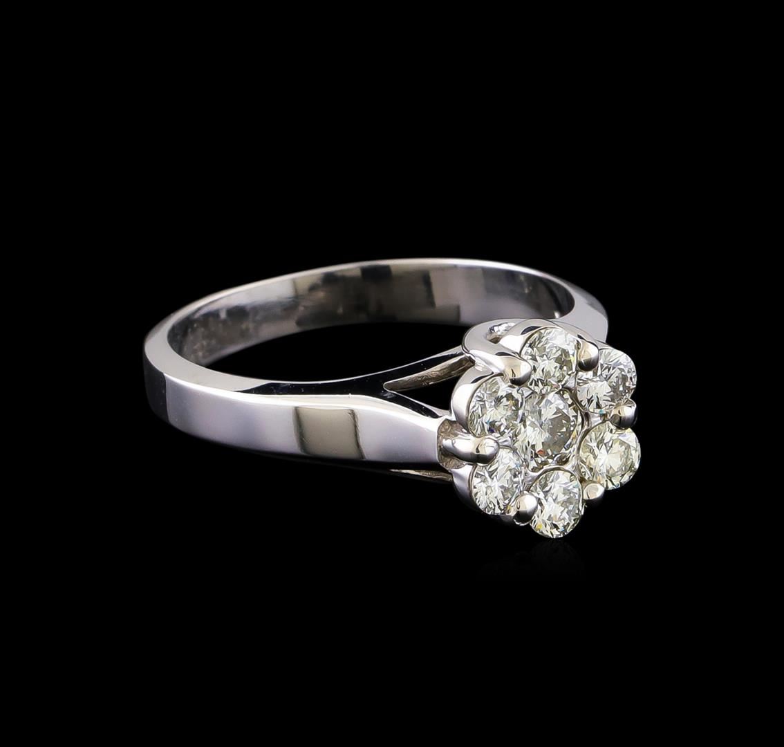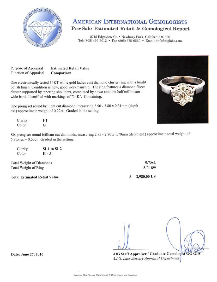 One electronically tested 14KT white gold ladies cast diamond cluster ring with a bright polish finish. The ring features a diamond floret cluster supported by tapering shoulders, completed by a two and one-half millimeter wide band. Identified with markings of "14K". Condition is new, good workmanship. Containing: One prong set round brilliant cut diamond, measuring 3.90 - 3.80 x 2.31mm (depth est.) approximate weight of 0.22ct. Graded in the setting. Clarity: I-1. Color: G Six prong set round brilliant cut diamonds, measuring 2.85 - 2.80 x 1.70mm (depth est.) approximate total weight of 6 Stones = 0.53ct. Graded in the setting. Clarity: SI-1 to SI-2. Color: H - J. Total Weight of Diamonds 0.75ct. Total Weight of Ring 3.71gm. AIG Appraised at $2,980.00.