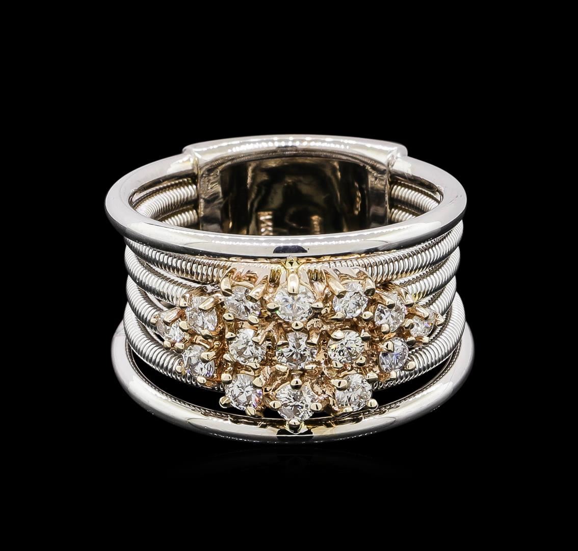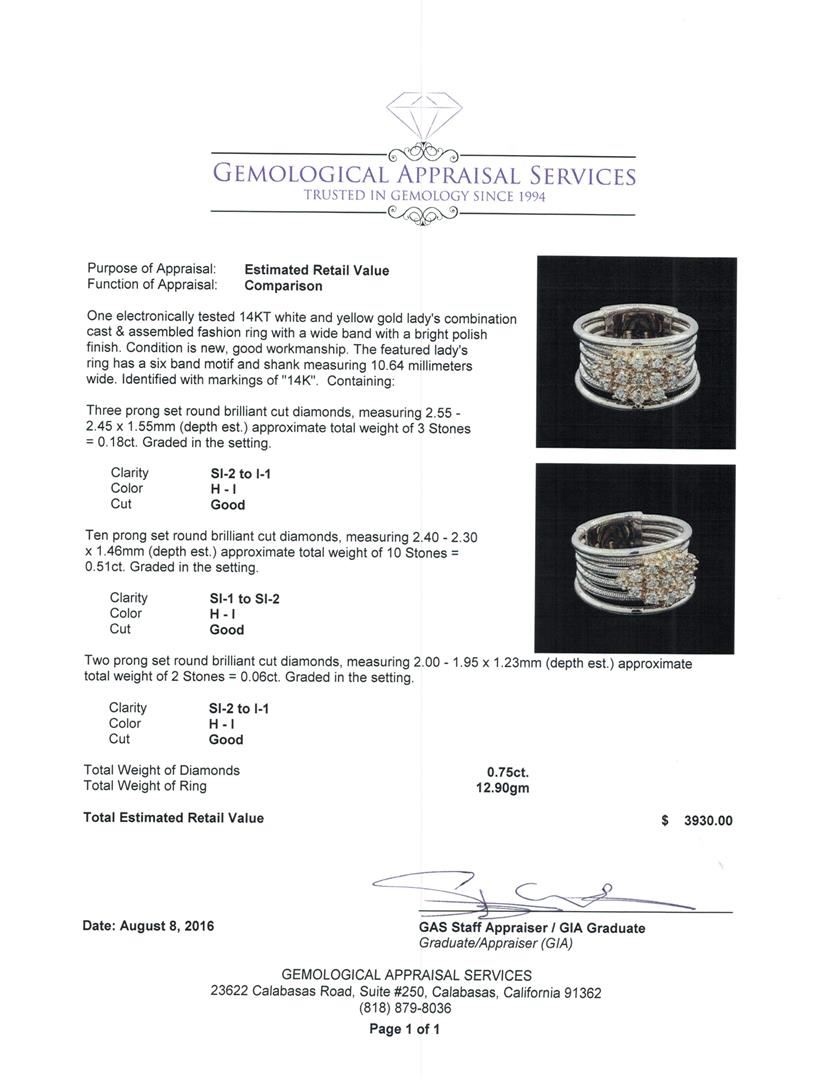 One electronically tested 14KT white and yellow gold lady's combination cast & assembled fashion ring with a wide band with a bright polish finish. The featured lady's ring has a six band motif and shank measuring 10.64 millimeters wide. Identified with markings of '14K'. Condition is new, good workmanship. Containing: Three prong set round brilliant cut diamonds, measuring 2.55 - 2.45 x 1.55mm (depth est.) approximate total weight of 3 Stones = 0.18ct. Graded in the setting. Clarity SI-2 to I-1. Color: H - I Cut Good Ten prong set round brilliant cut diamonds, measuring 2.40 - 2.30 x 1.46mm (depth est.) approximate total weight of 10 Stones = 0.51ct. Graded in the setting. Clarity SI-1 to SI-2. Color: H - I Cut Good Two prong set round brilliant cut diamonds, measuring 2.00 - 1.95 x 1.23mm (depth est.) approximate total weight of 2 Stones = 0.06ct. Graded in the setting. Clarity SI-2 to I-1. Color: H - I Cut Good. Total Weight of Diamonds 0.75ct.. Total Weight of Ring 12.90gm. GAS Appraised at $3,930.00.
