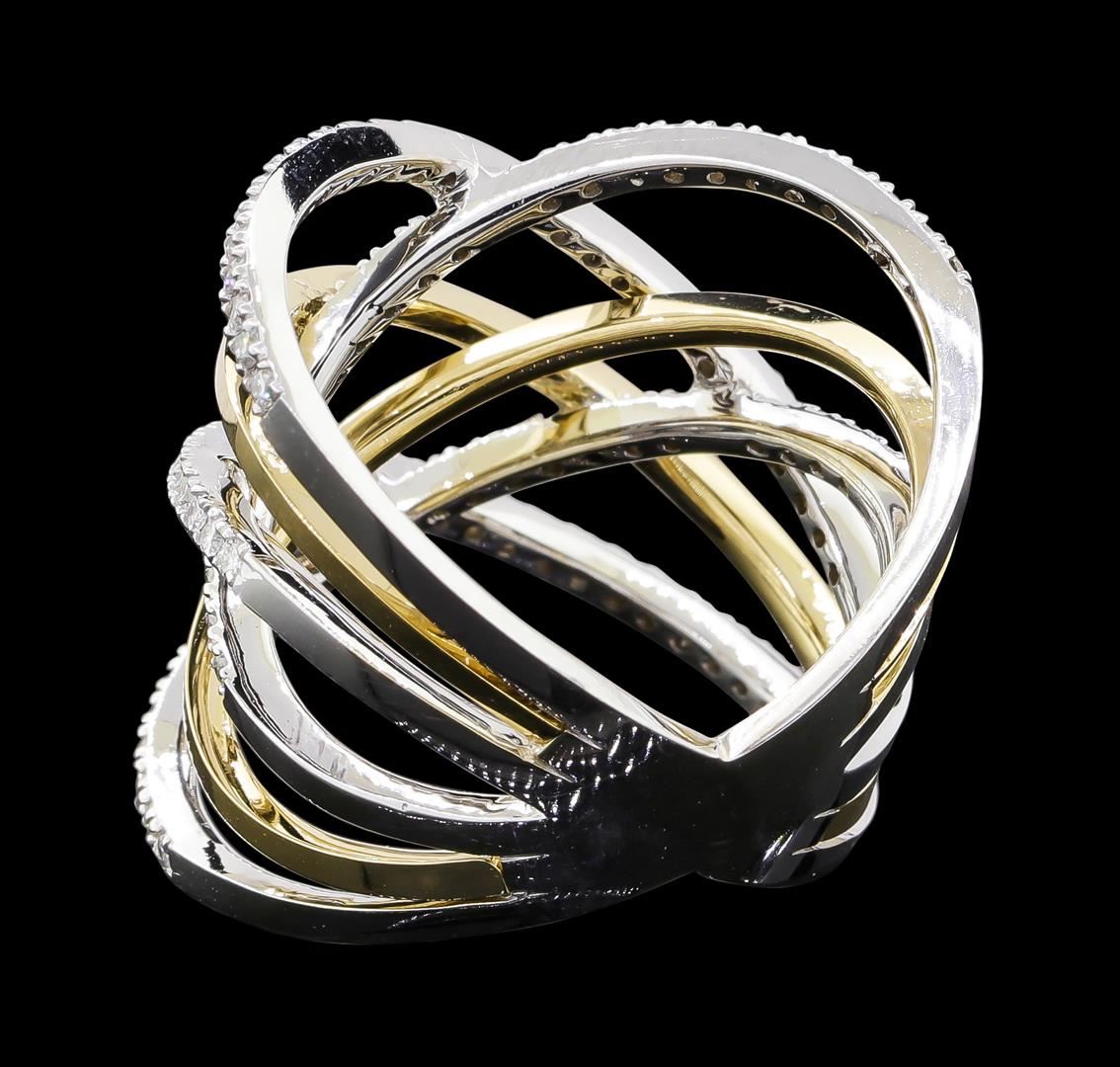 One electronically tested 14KT white and yellow gold lady's combination cast & assembled fashion crossover ring with a tapered shank with a bright polish finish. The featured lady's ring has six crossover rows and a shank measuring 5.25 millimeters wide. Identified with markings of 'K14'. Condition is new, good workmanship. Containing: One Hundred prong set round brilliant cut diamonds, measuring 1.30 - 1.25 x 0.77mm (depth est.) approximate total weight of 100 Stones = 0.75ct. Graded in the setting. Clarity SI-1 to I-1. Color: H - I Cut Good. Total Weight of Diamonds 0.75ct.. Total Weight of Ring 9.00gm. GAS Appraised at $3,960.00.